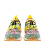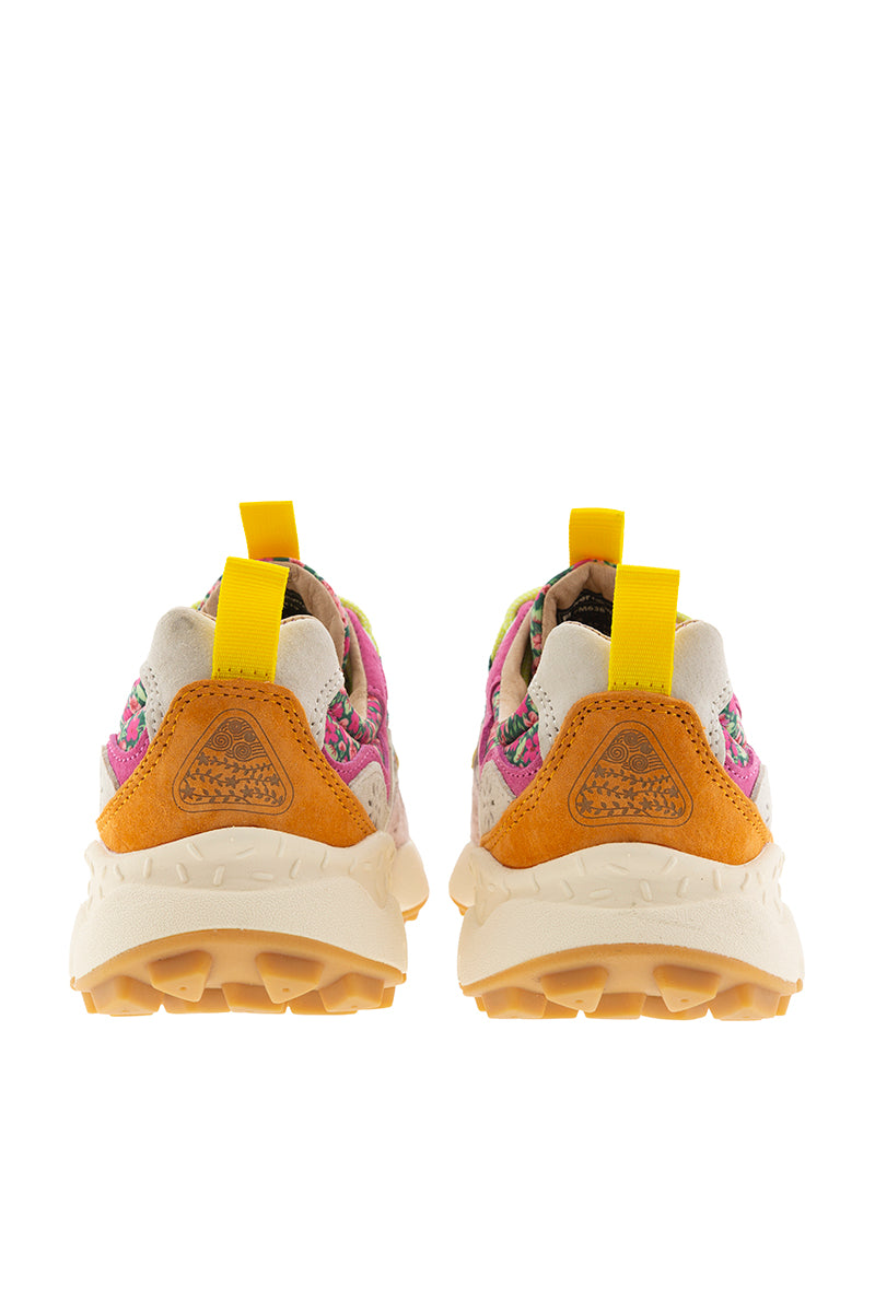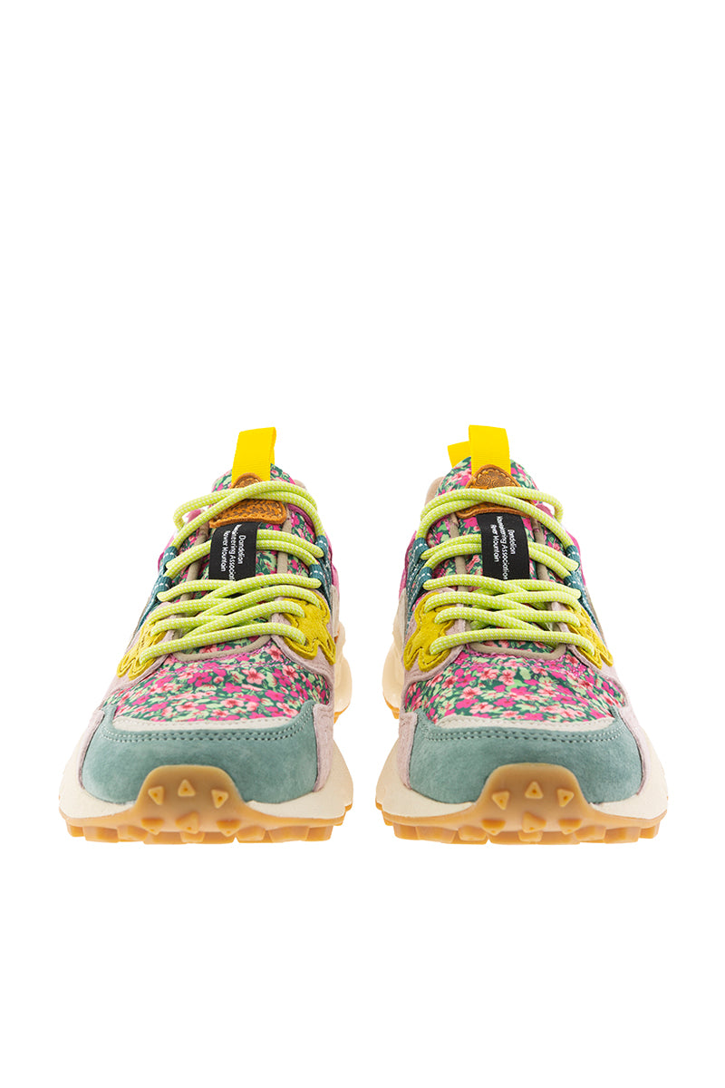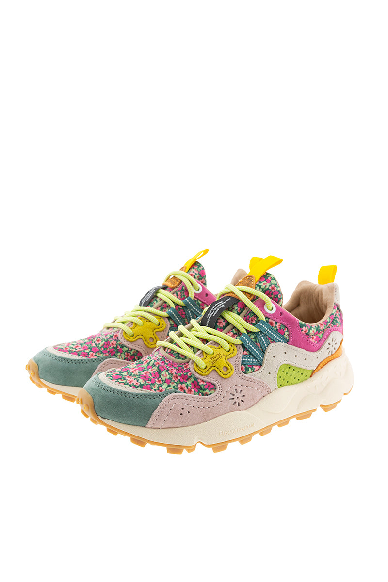 حذاء رياضي يامانو 3 من فلاور ماونتن، من اليابان. يتميز بتصميم يجمع بين قماش بنقشة زهور بألوان الوردي والأخضر على خلفية سوداء، مع جلد سويدي بألوان الأزرق البترولي والأخضر والفوشيا والوردي. وتضفي تفاصيل غروغرين الصفراء لمسة من الأناقة. يحتوي الحذاء على أربطة دائرية على طراز أحذية الرحلات باللون الأخضر التفاحي، ونعل داخلي من الفلين الطبيعي المضاد للبكتيريا، ونعل خارجي مطاطي خفيف الوزن للغاية ومسنن بلون الجلد.
