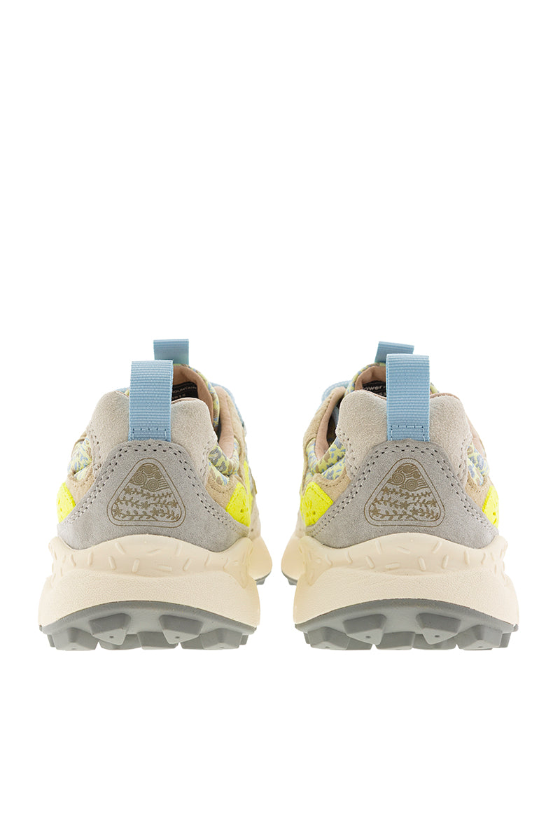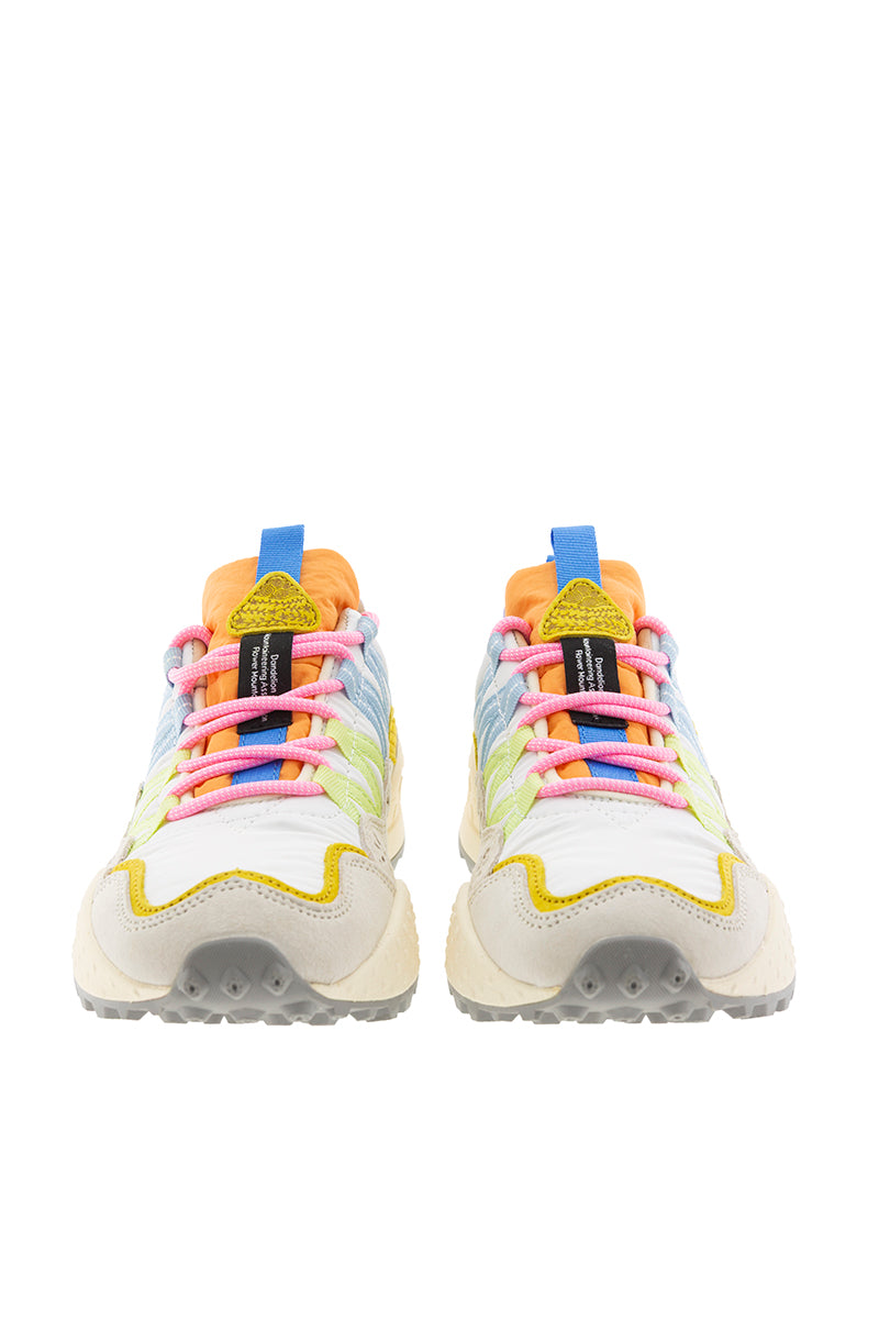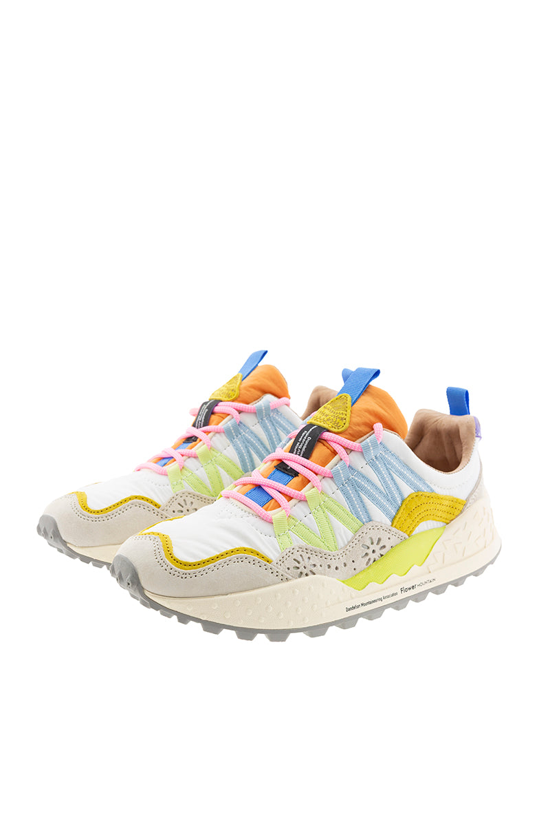 حذاء رياضي من طراز واشي. مزيج من النايلون الأبيض مع تفاصيل من جلد الغزال الأصفر والرمادي. أربطة دائرية بلون الفوشيا بنمط أحذية الرحلات. نعل داخلي من الفلين الطبيعي المضاد للبكتيريا ونعل خارجي مطاطي مسنن فائق الخفة.