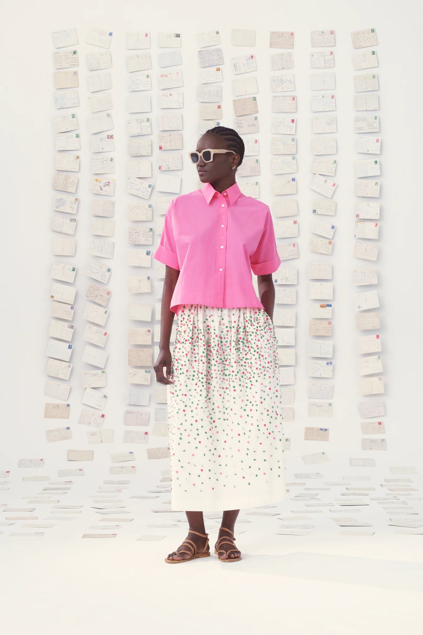 قميص ألبا، بأكمام قصيرة وقصة واسعة، مصنوع من قماش البوبلين القطني. قطعة زاهية الألوان ورسومات مميزة، مثالية لأيام الصيف الجميلة. لون وردي فاتح. الخامة: ١٠٠٪ قطن.