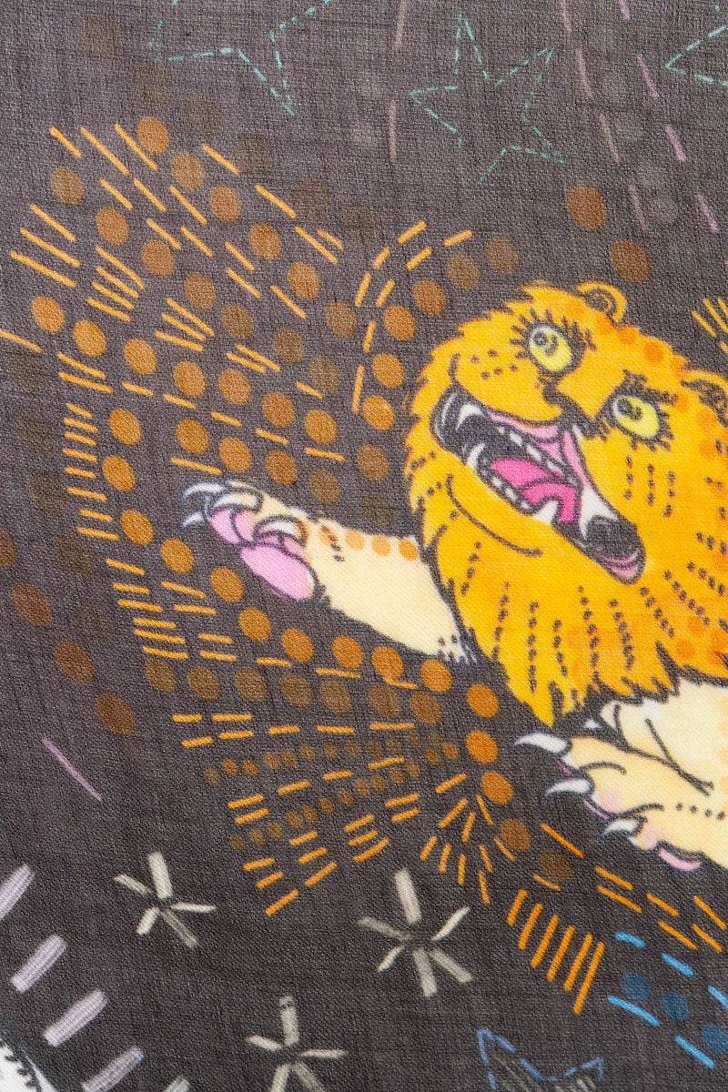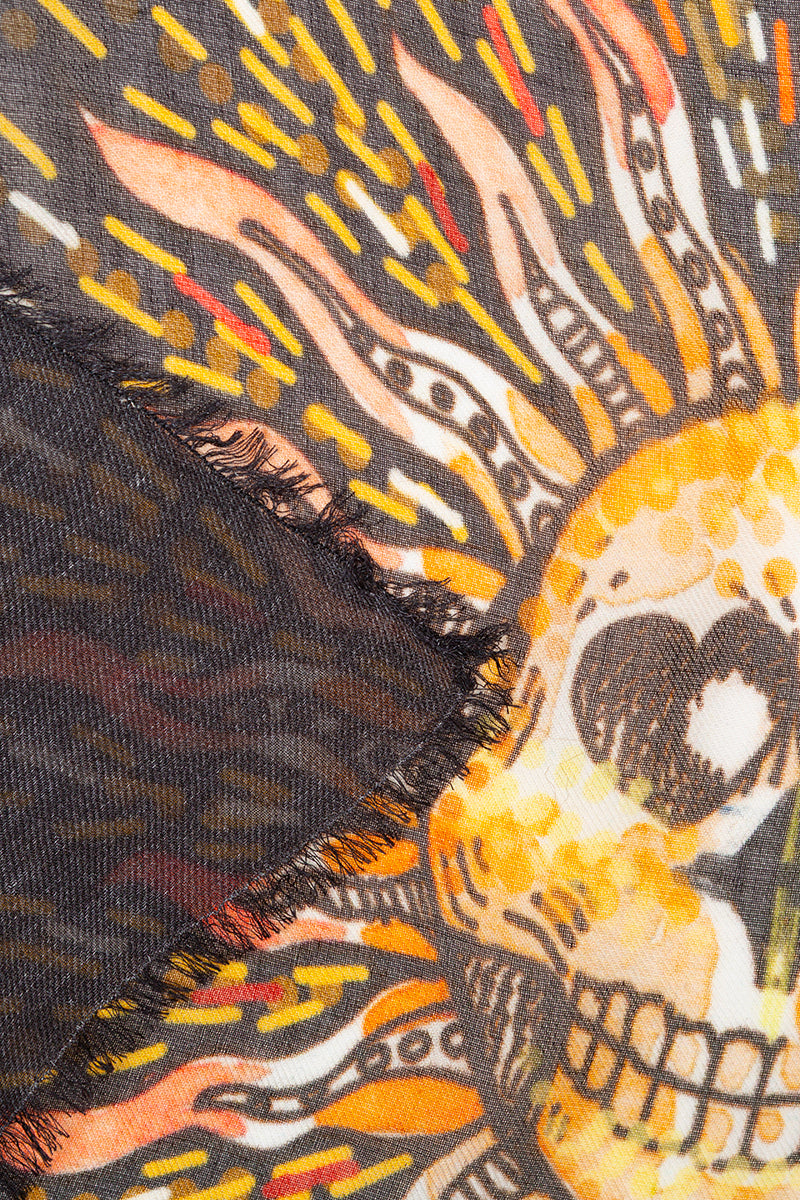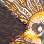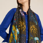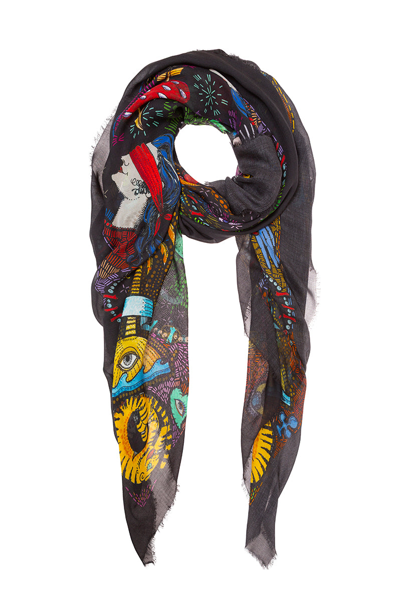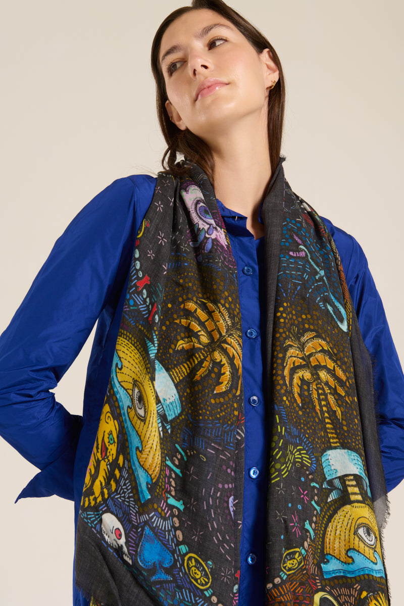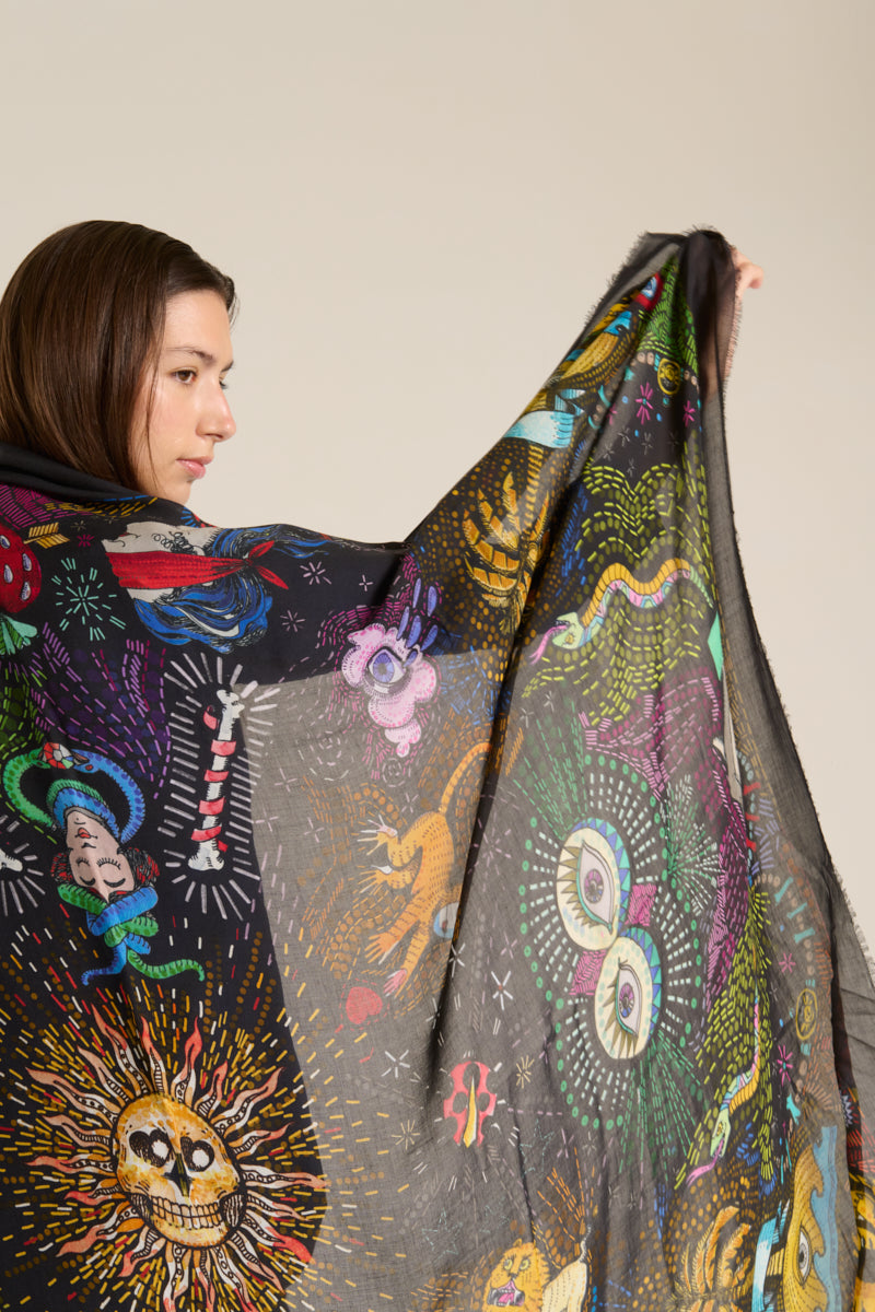 وشاح "النبي" من تصميم فاليرو سارتي. يظهر النبي على خلفية سوداء، محاطًا بعالمه السحري بألوان زاهية. صنع في إيطاليا. التركيب: 90% مودال، 10% كشمير. المقاس: 130 × 165 سم.