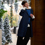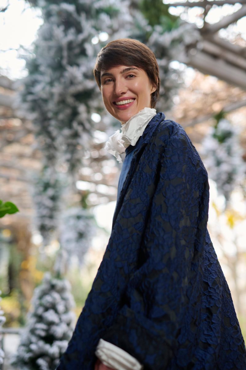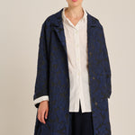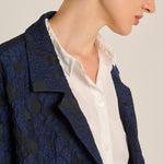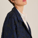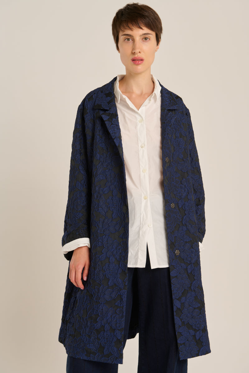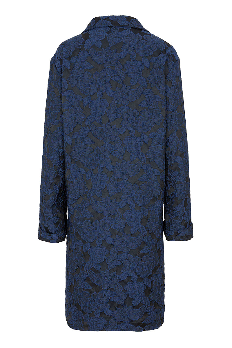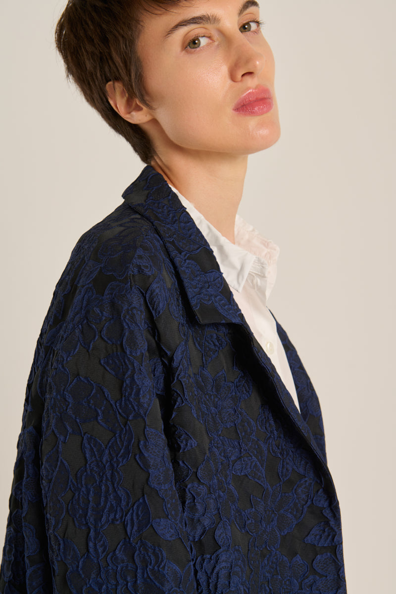 معطف من قماش البروكار مزين بأزهار زرقاء داكنة على خلفية سوداء. 64% بوليستر، 33% بوليستر معاد تدويره، 3% بولي أميد. صنع في ألمانيا. المقاسات ألمانية.