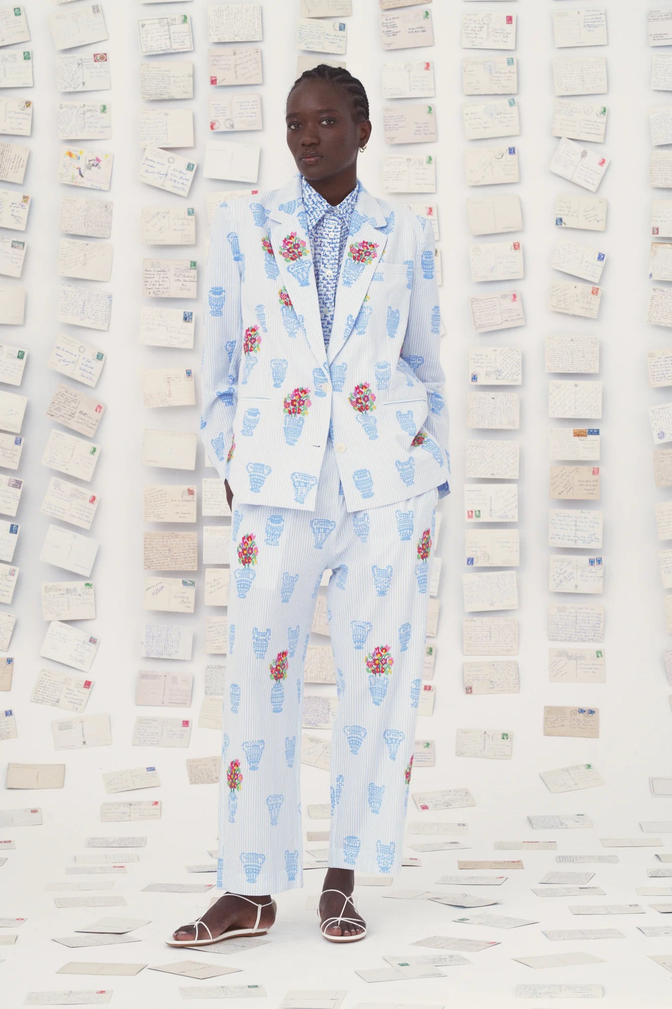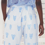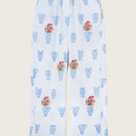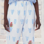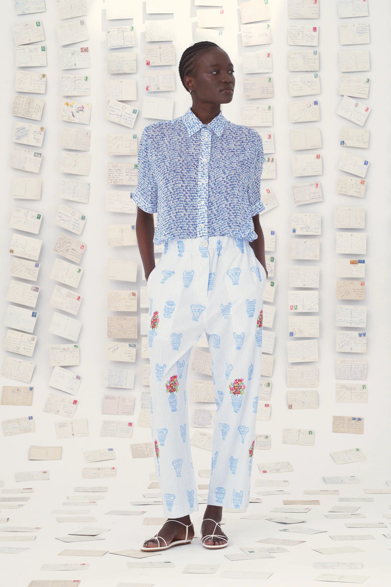 يتميز بنطال كيكا، المصنوع من قطن السيرساكر، برسومات مزهريات مطبوعة مستوحاة من جزر سيكلاديز. وتُضفي الأزهار المطرزة يدويًا لمسة جمالية على التصميم، مانحةً إياه عمقًا وملمسًا مميزًا. ويتناسق هذا البنطال بشكل مثالي مع جاكيت تيتي الذي يحمل نفس النقشة. يتميز هذا البنطال الأبيض المخطط باللون الأزرق الفاتح بحزام خصر مطاطي وجيوب جانبية. الخامة: 100% قطن.