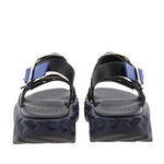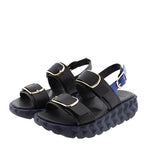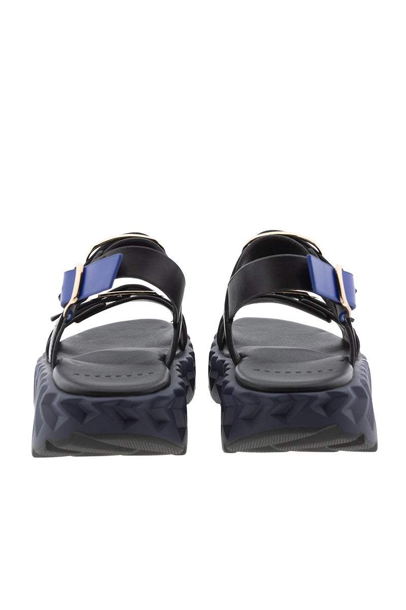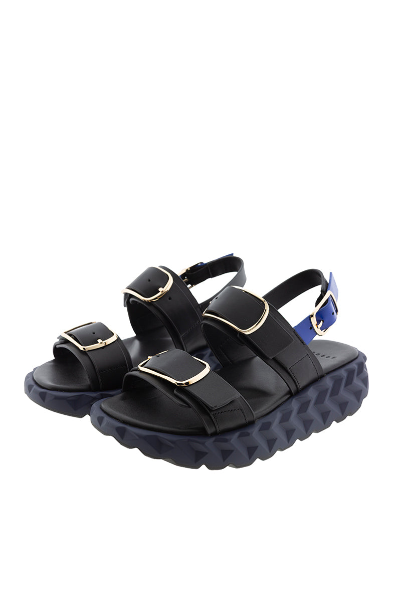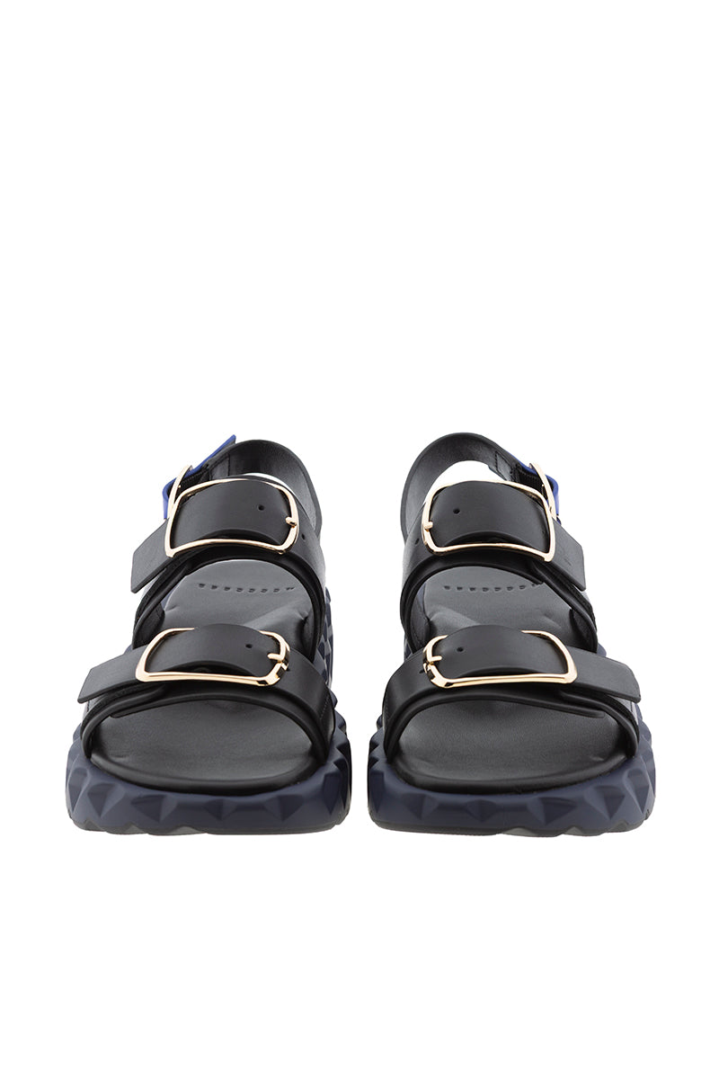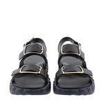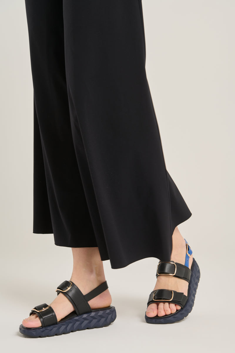 Sandalia negra funcional y elegante, con tres tiras ajustables y hebillas metálicas para un ajuste cómodo y personalizado. Su diseño combina estilo chic con una suela plisada que distribuye la presión al caminar, ofreciendo confort, flexibilidad y buena resistencia al deslizamiento. Altura de 40 mm, con exterior de piel de vacuno, interior de piel de oveja y suela de TPU.