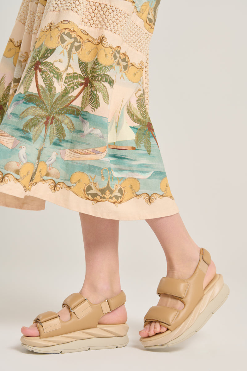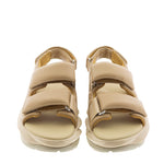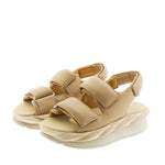 Sandalia beige cómoda y funcional para el día a día, con tiras anchas ajustables en piel de oveja acolchada que garantizan un ajuste seguro. Incorpora suela ondulada de doble capa que mejora el impulso, absorbe impactos y aporta estabilidad. Altura de 55 mm, con interior en tejido y piel y suela de espuma EVA.