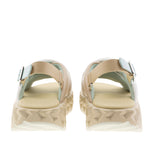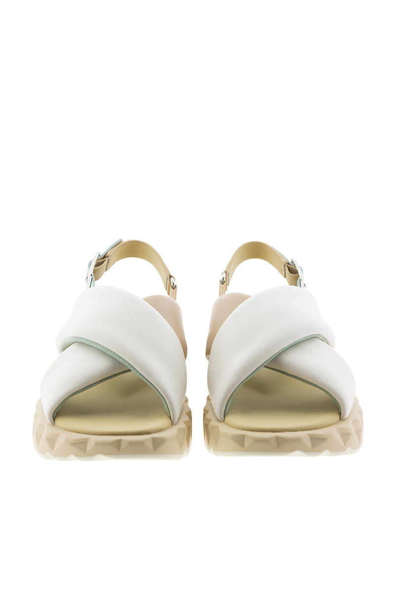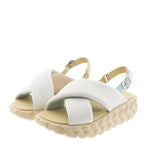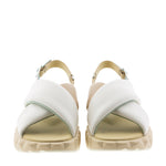 Sandalia blanca de tiras cruzadas en piel suave, con correa ajustable en el talón y hebilla metálica que añade un toque veraniego. Incorpora suela ondulada de doble capa que combina amortiguación y resistencia para mayor comodidad y durabilidad. Altura de 55 mm, con mezcla de piel y tejido y suela de EVA.