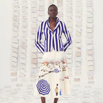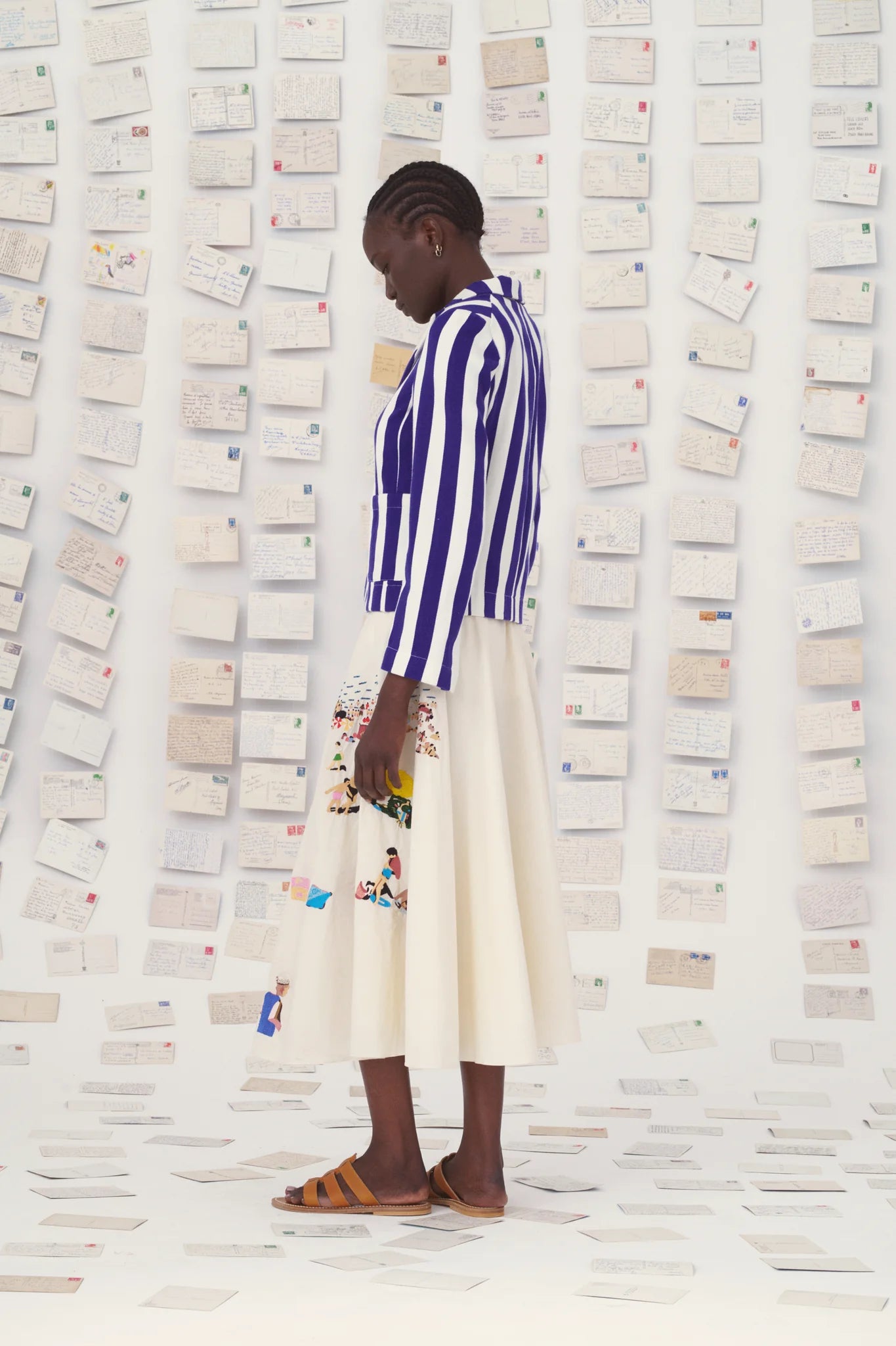 تنورة كورفو مصنوعة من قماش البوبلين القطني، وهي ضيقة عند الخصر ثم تتسع قليلاً عند الحافة. تفاصيلها المطرزة يدويًا تستحضر صورةً أيقونيةً لبطاقات بريدية العطلات: مناظر شاطئية صيفية خلابة! تتميز التنورة بخلفية بلون طبيعي مع تطريز متعدد الألوان، وإغلاق بأزرار في الخلف، وبطانة داخلية. التركيب: 100% قطن.