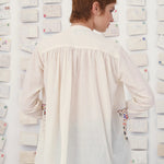 قميص ناتالي ذو الياقة الماندرين مصنوع يدويًا بالكامل من قطن الكادي الخفيف. تصميمه المطرز يدويًا يستحضر أجواء بطاقات المعايدة الصيفية: مناظر شاطئ البحر! يتميز بلون أبيض كريمي وإغلاق بأزرار مخفية. الخامة: 100% قطن.