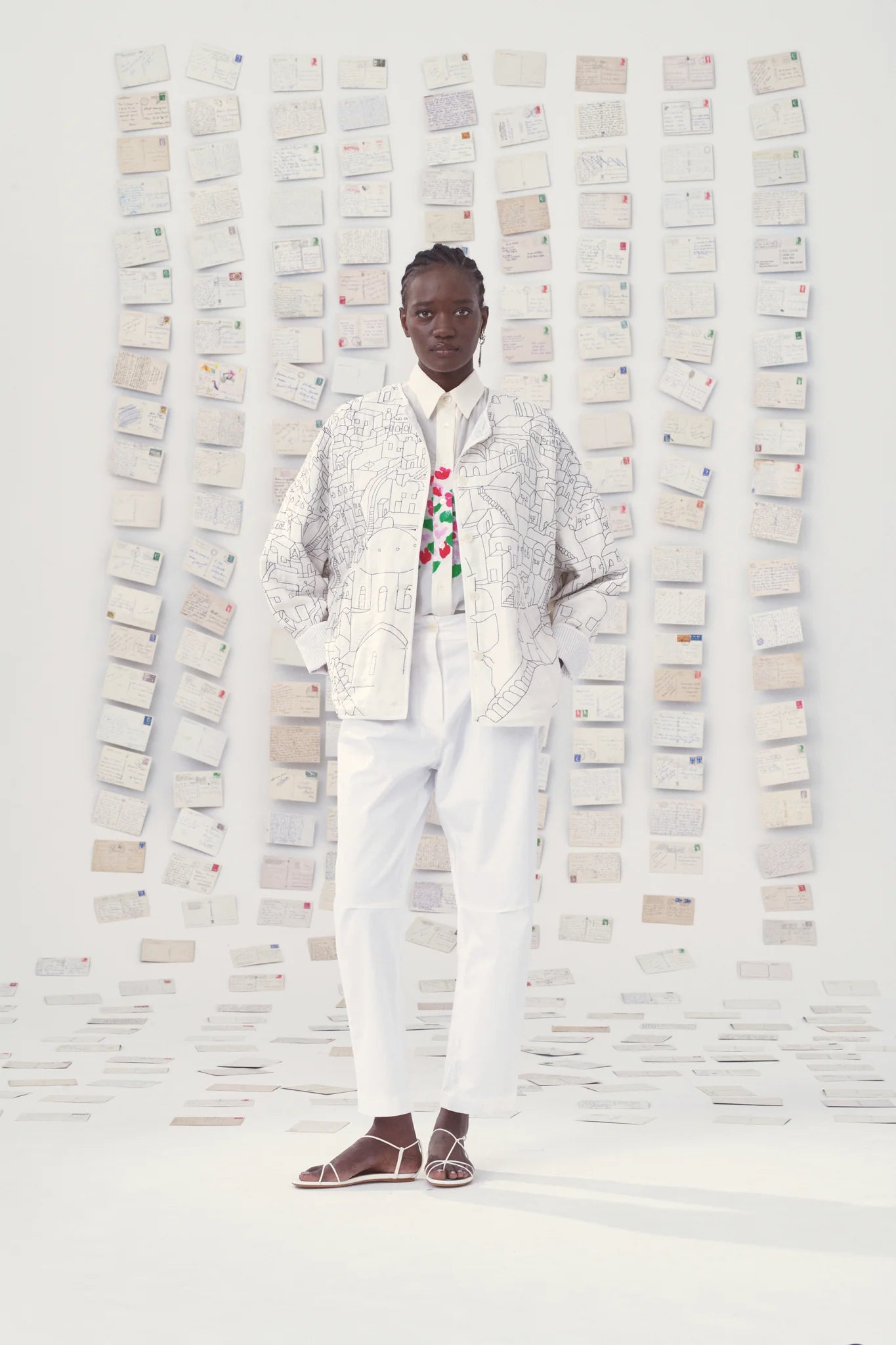 جاكيت ديتي، ذو الياقة الماندرين، مصنوع من حرير الساتان ومطرز بالكامل بنقوش مستوحاة من القرى اليونانية، قطعة أنيقة من الأزياء الراقية مستوحاة من أرخبيل سيكلاديز. يتميز بتصميم أبيض بخيوط سوداء. هذا الجاكيت الواسع غير المتماثل مزود بجيوب أمامية وإغلاق بأزرار. الخامة: 100% حرير، البطانة: 100% قطن.