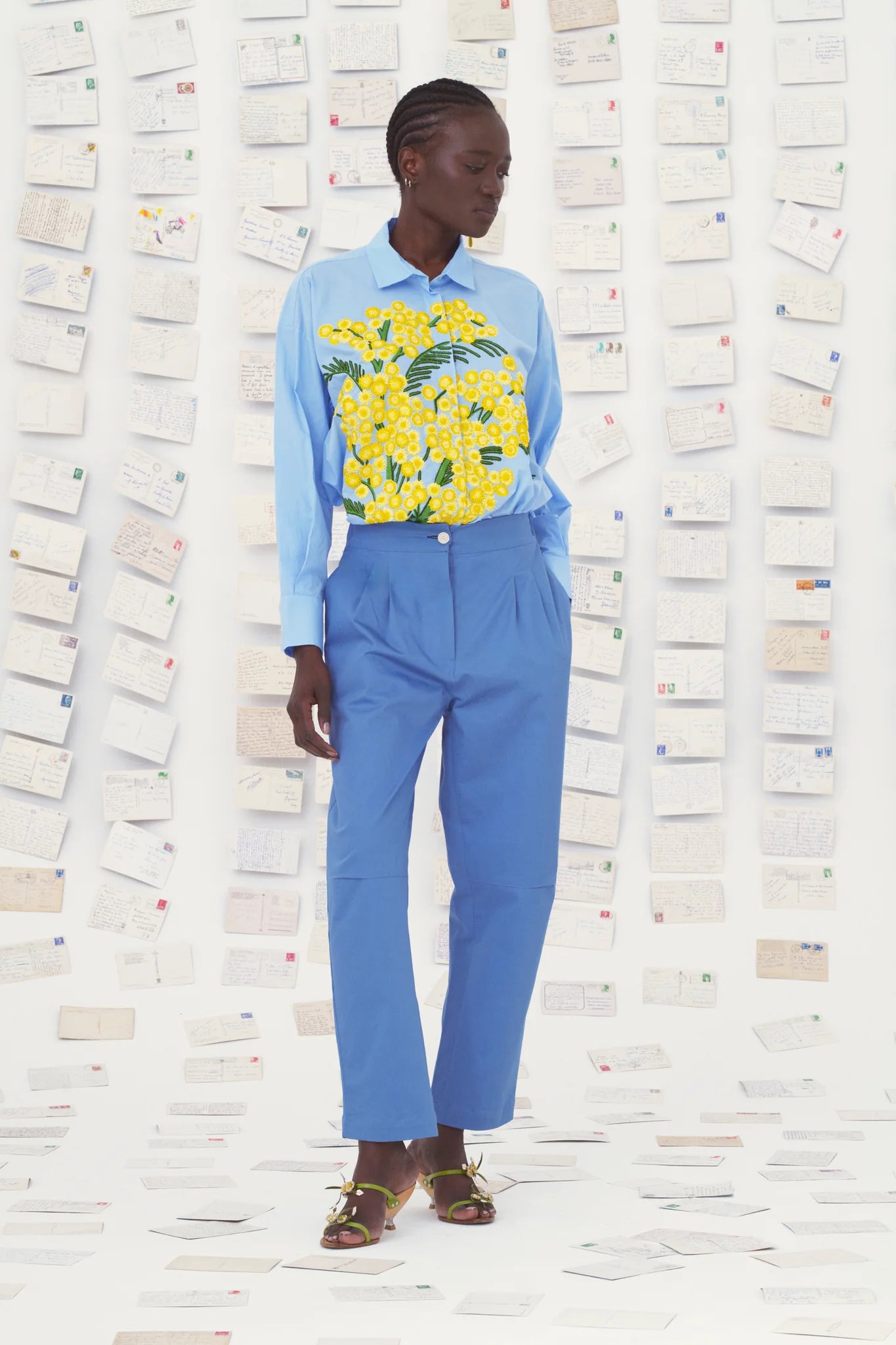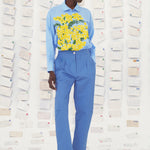 قميص غريتا، المصنوع من قماش البوبلين القطني، يحتفي بزهرة الميموزا، الزهرة المشرقة والرمزية لجنوب فرنسا. كل زهرة مطرزة يدويًا بدقة متناهية. هذا هو قميص الميموزا النهاري. قميص واسع بإغلاق أزرار مخفية وفتحات جانبية. لون أزرق فاتح مع زهور صفراء مطرزة. الخامة: 100% قطن.