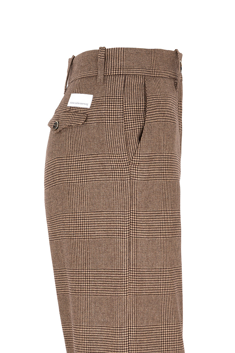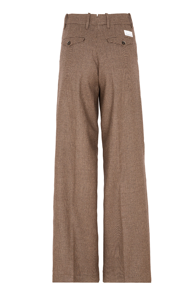 بنطال بخصر عالٍ وقصة مستقيمة. جيبان جانبيان أماميان وجيبان خلفيان بإغلاق بأزرار. حلقات حزام عند الخصر. نقشة مربعات أمير ويلز باللونين الرملي والبني. التركيب: 55% صوف بكر، 30% حرير، 15% كشمير. صنع في إيطاليا. المقاسات إيطالية.