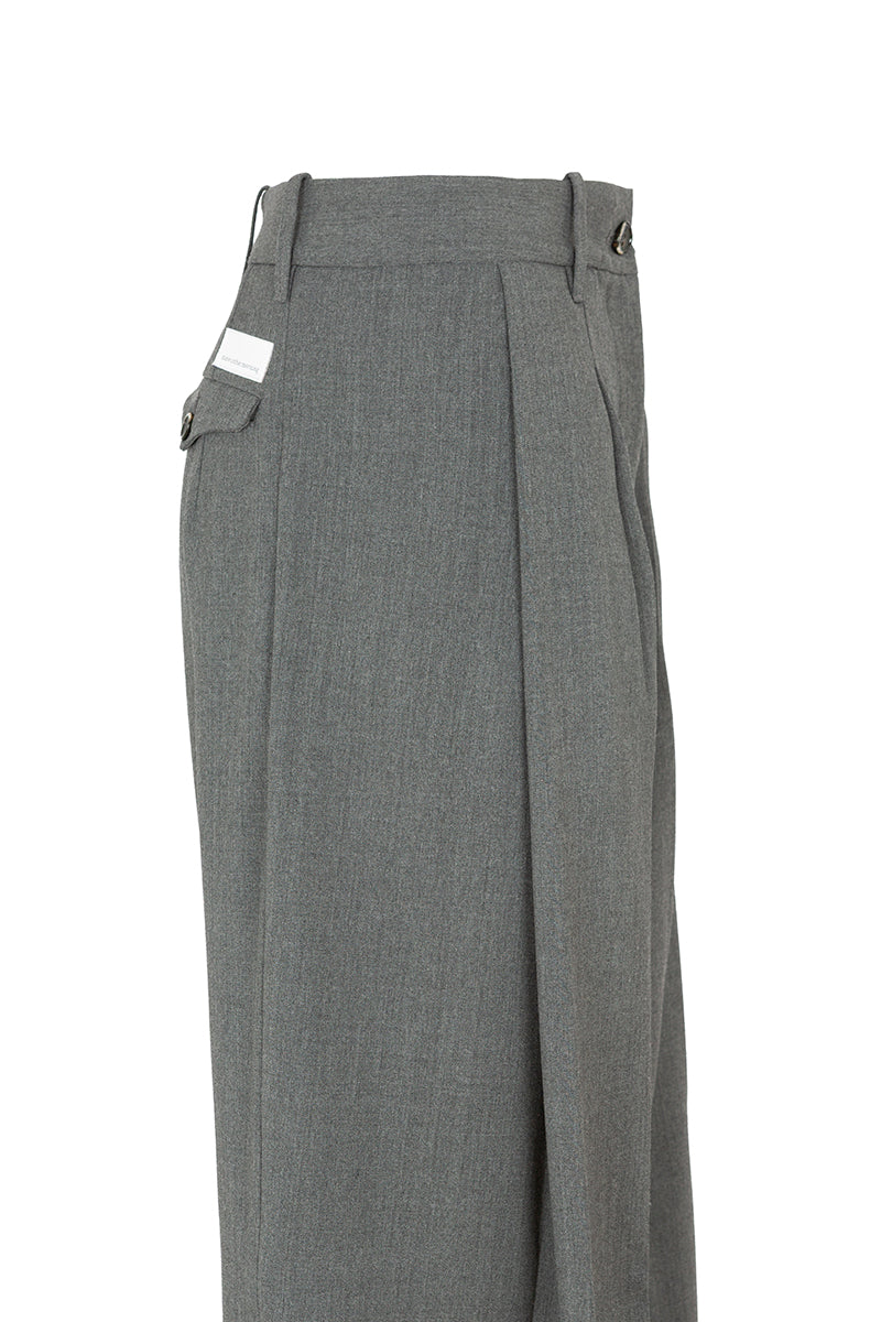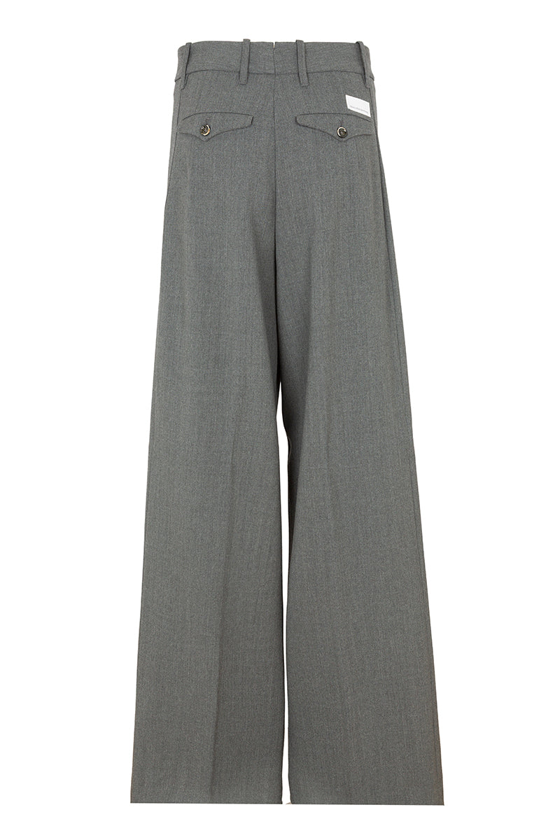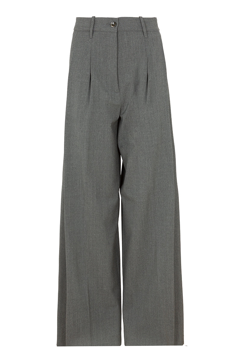 بنطال واسع الساقين بخصر عالٍ وثنيات من ناين إن ذا مورنينج. جيبان أماميان مخفيان داخل الثنيات وجيبان خلفيان. لون رمادي فحمي. حلقات حزام عند الخصر. التركيب: 53% بوليستر، 43% صوف بكر، 4% إيلاستين. صنع في إيطاليا. المقاسات إيطالية.