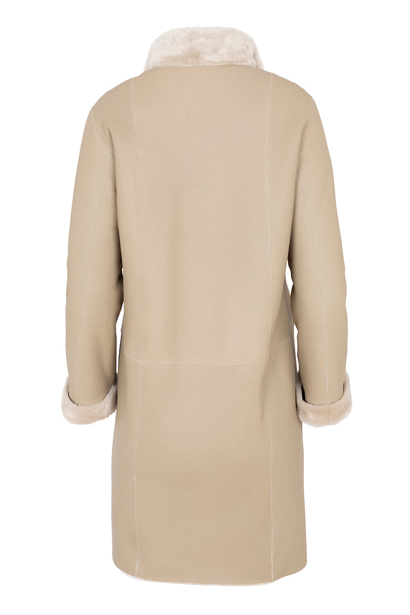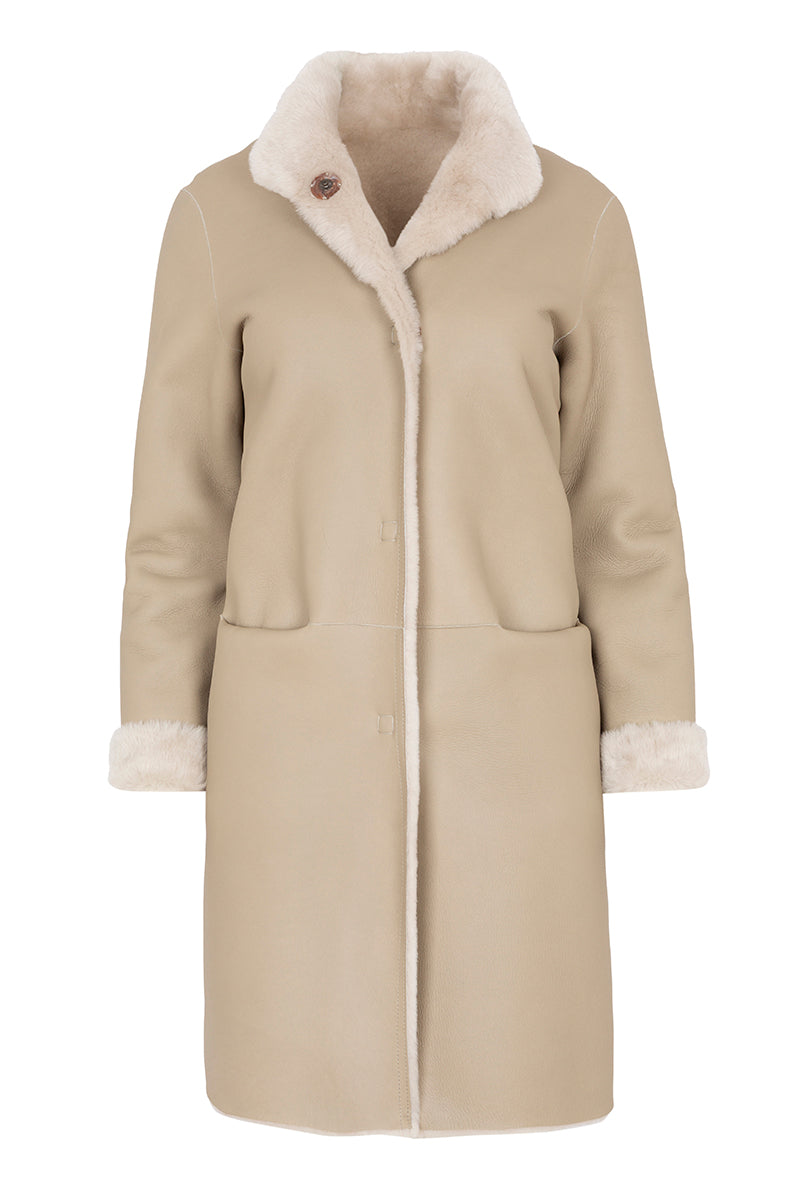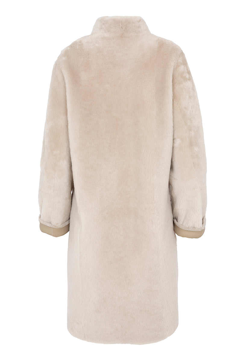 معطف من جلد الخروف الإسباني. أكمام طويلة بياقة صينية، قابل للارتداء على الوجهين. البطانة الداخلية من جلد نابا بلون بيج فاتح، والبطانة الخارجية من فرو أبيض ناصع معالج. زر كبس بلون صدفة السلحفاة. مصنوع من جلد خروف إسباني 100%.