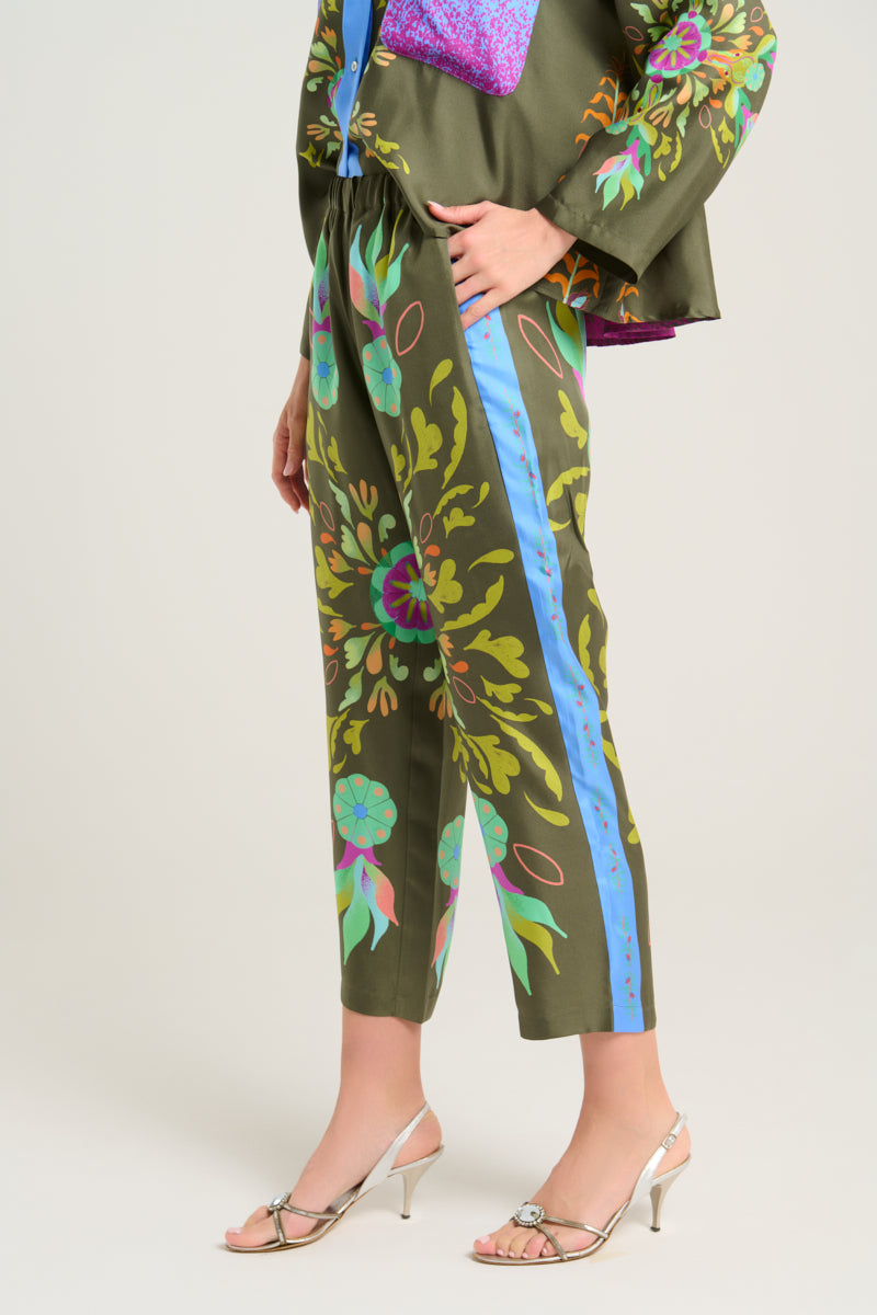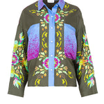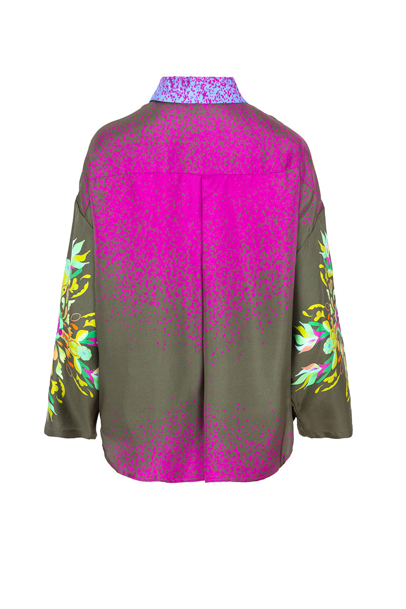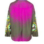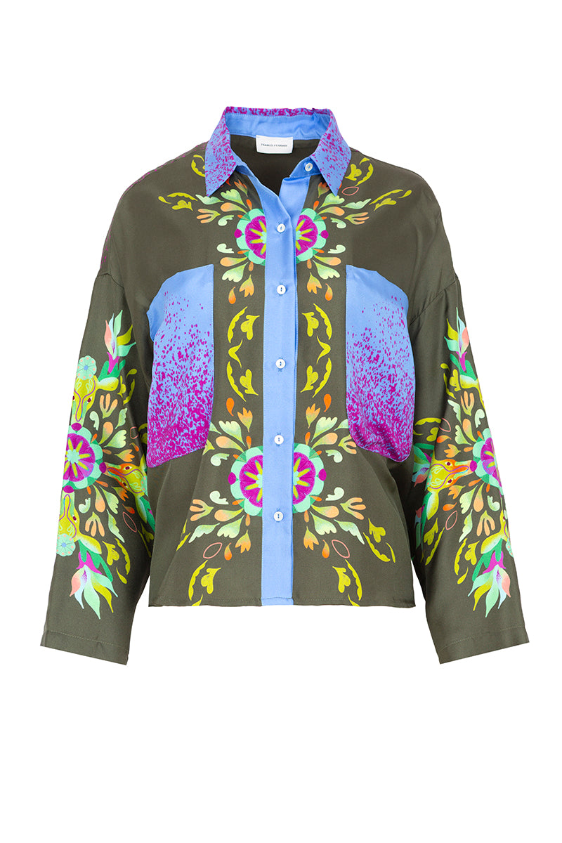 بلوزة من العلامة التجارية الإيطالية فرانكو فيراري، ضمن مجموعة محدودة بالتعاون مع الرسامة المكسيكية ناندي غارسيا. تتميز بقصة مريحة، وياقة قميص مع إغلاق بأزرار أمامية، وجيبين أماميين، وثنية في الخلف. تزدان البلوزة بطبعة زهور متعددة الألوان على خلفية زيتونية وفوشية. مصنوعة من الحرير الخالص ١٠٠٪.