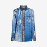 قميص حريري انسيابي مزين بطبعة فراشات على خلفية متدرجة بدرجات اللون الأزرق. جيب أمامي. الخامة: ١٠٠٪ حرير. صنع في إيطاليا. المقاسات إيطالية.