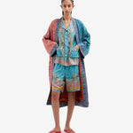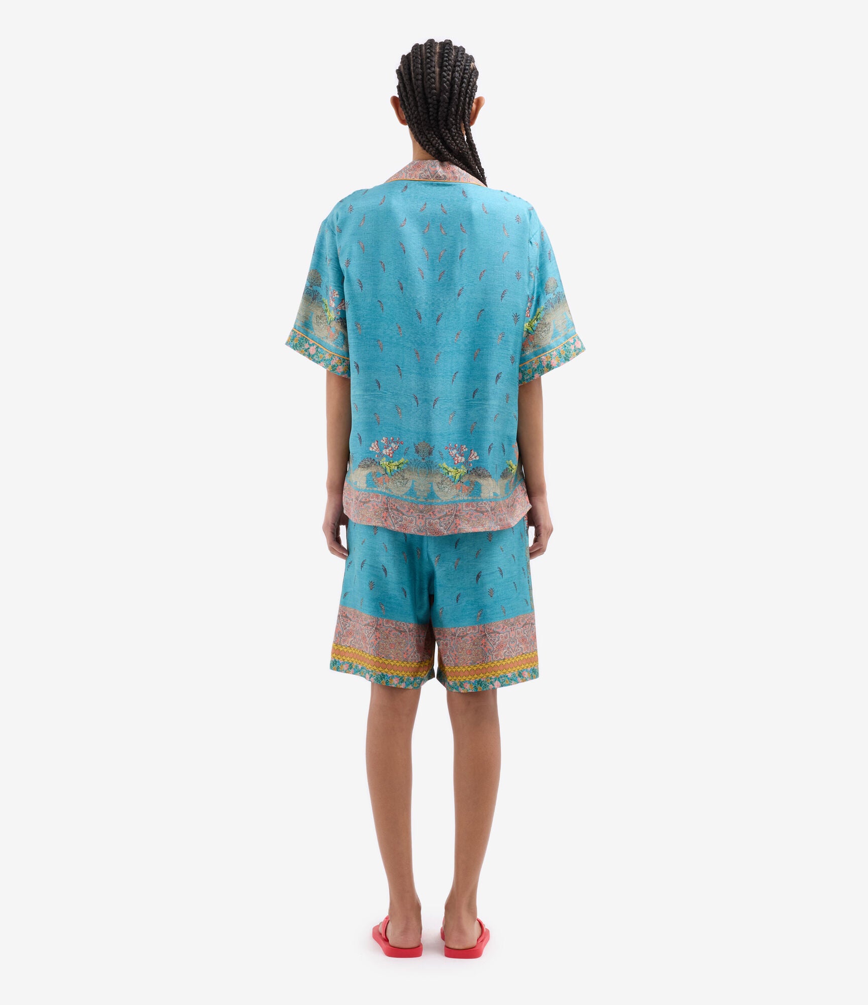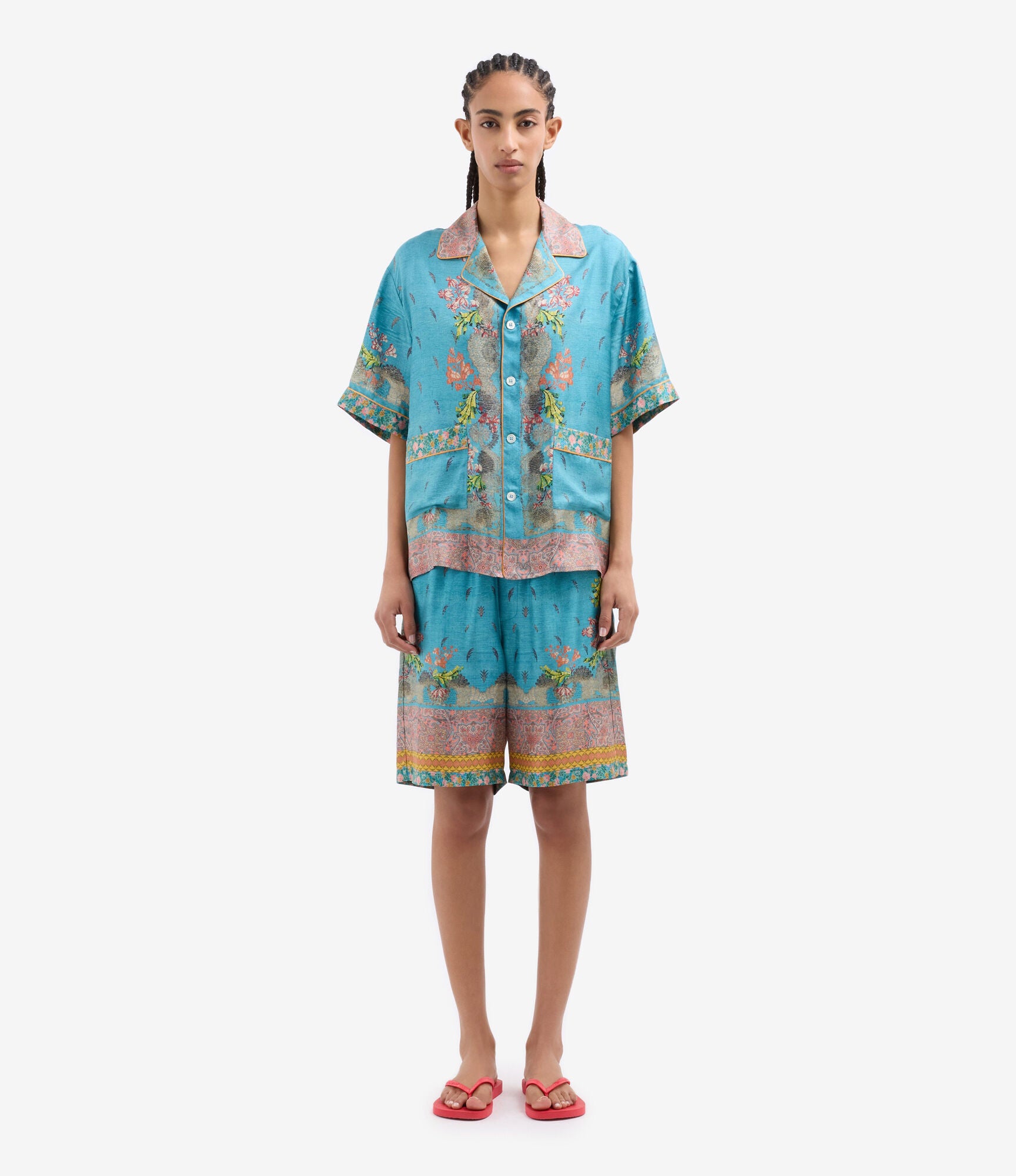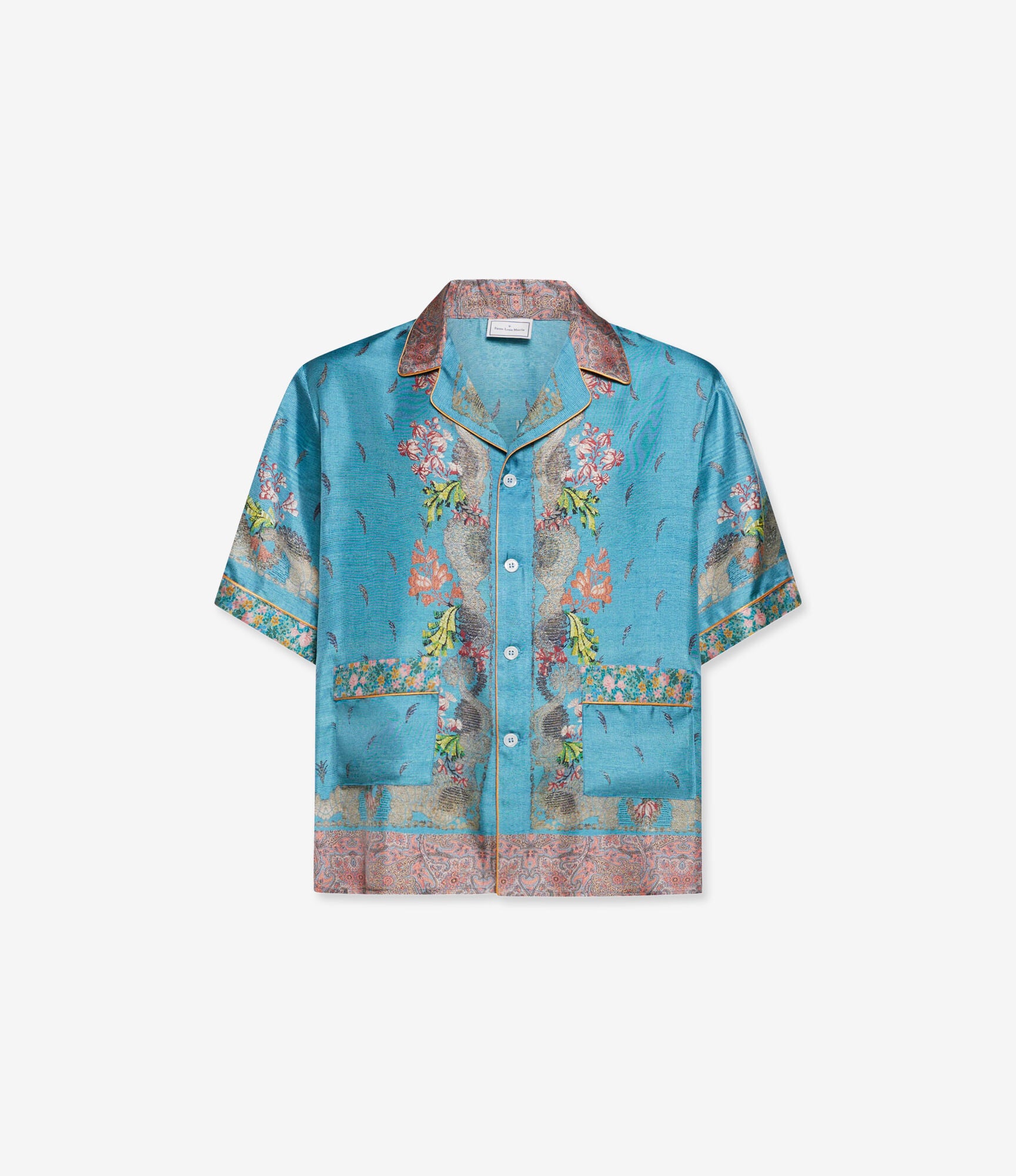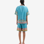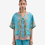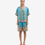 قميص بيجاما قصير الأكمام بياقة عريضة. إغلاق بأزرار، وجيوب أمامية، وفتحات جانبية. لون فيروزي بنقشات ليبرتي متعددة الألوان، تجمع بين نقشات البيزلي والأشكال الهندسية، ومُزيّن بحواف كهرمانية. الخامة: 100% حرير. مقاسات إيطالية، صنع في إيطاليا.