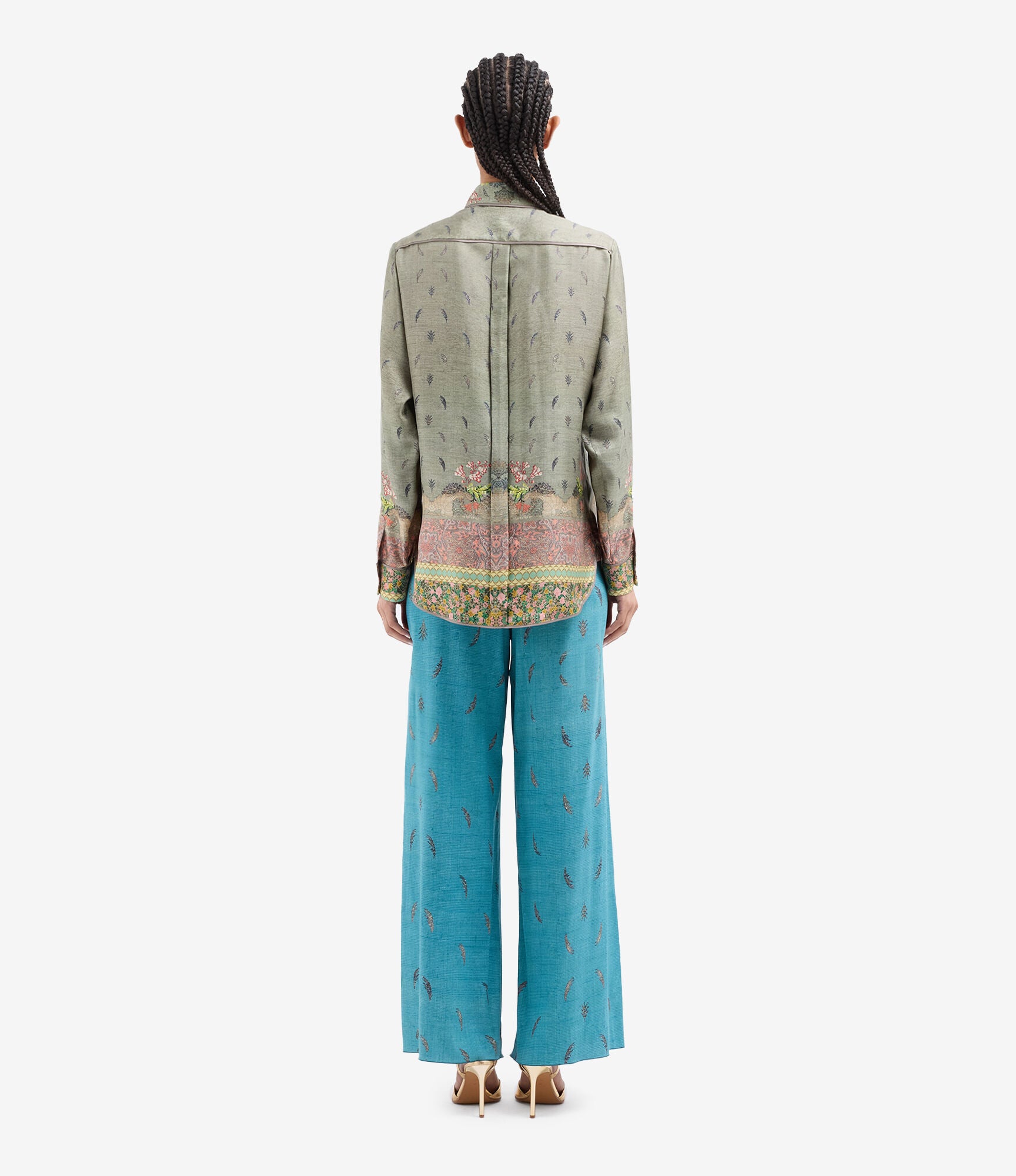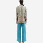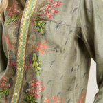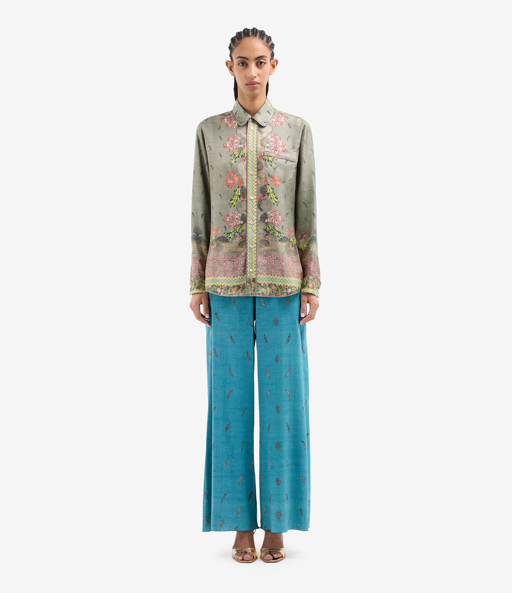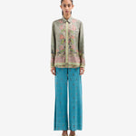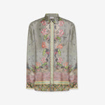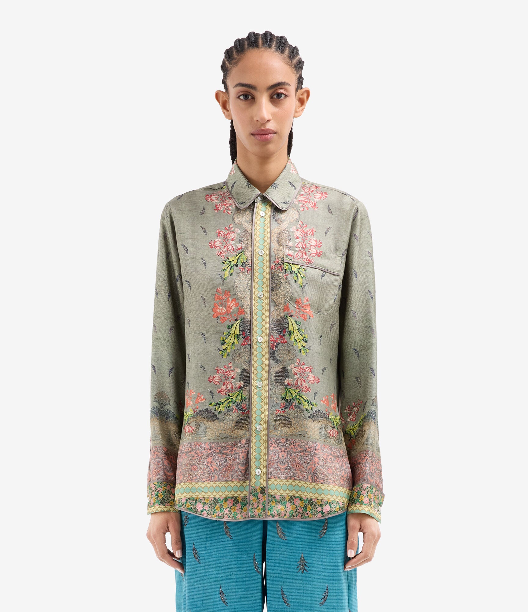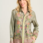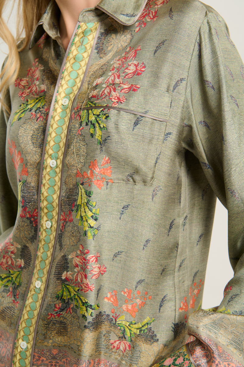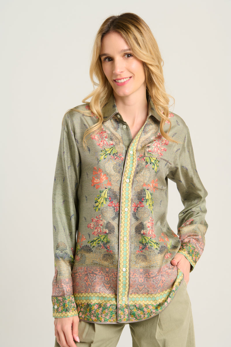 Camisa de seda fluida color verde, combinación de estampados paisley, geométrico y liberty multicolor. Bolsillo delantero. Composición :100% Seda. Hecho en Italia. Tallaje italiano.