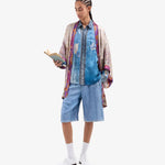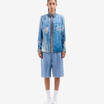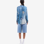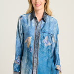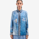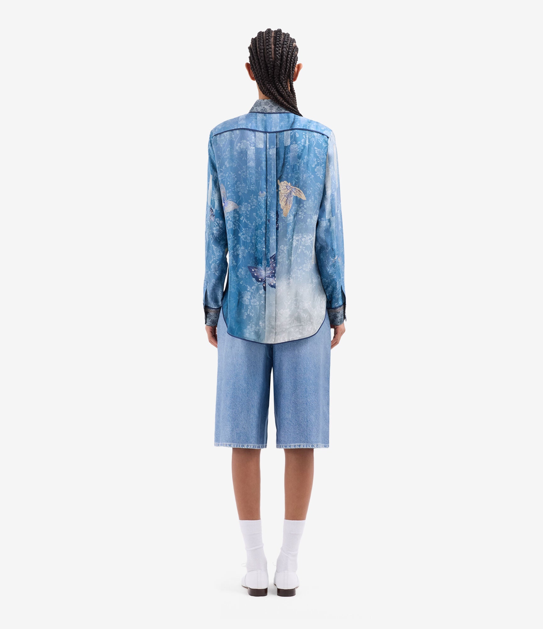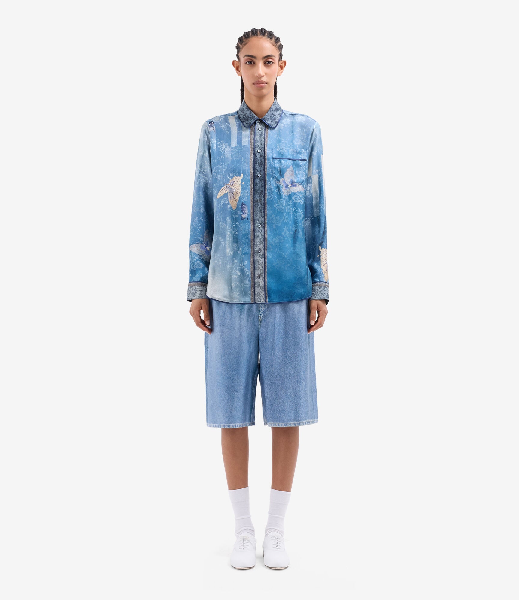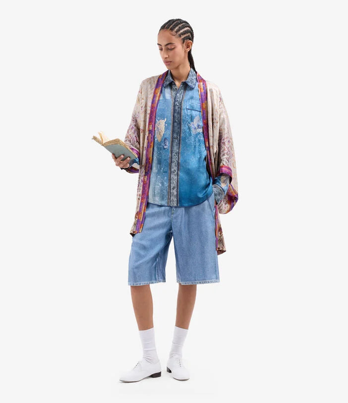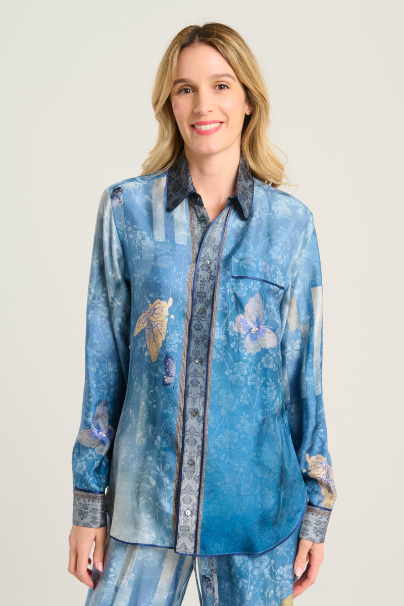 Camisa de seda fluida estampado mariposas sobre fondo degradé en tonos azules. Bolsillo delantero. Composición :100% Seda. Hecho en Italia. Tallaje italiano.