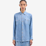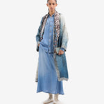 قميص حريري أصلي بتصميم خداع بصري يحاكي القصات والدرزات والأزرار وقماش الدنيم. جيوب أمامية بأغطية وأزرار مخفية بلون متناسق. تأثير أزرق باهت. الخامة: 100% حرير. صنع في إيطاليا، المقاسات إيطالية.