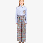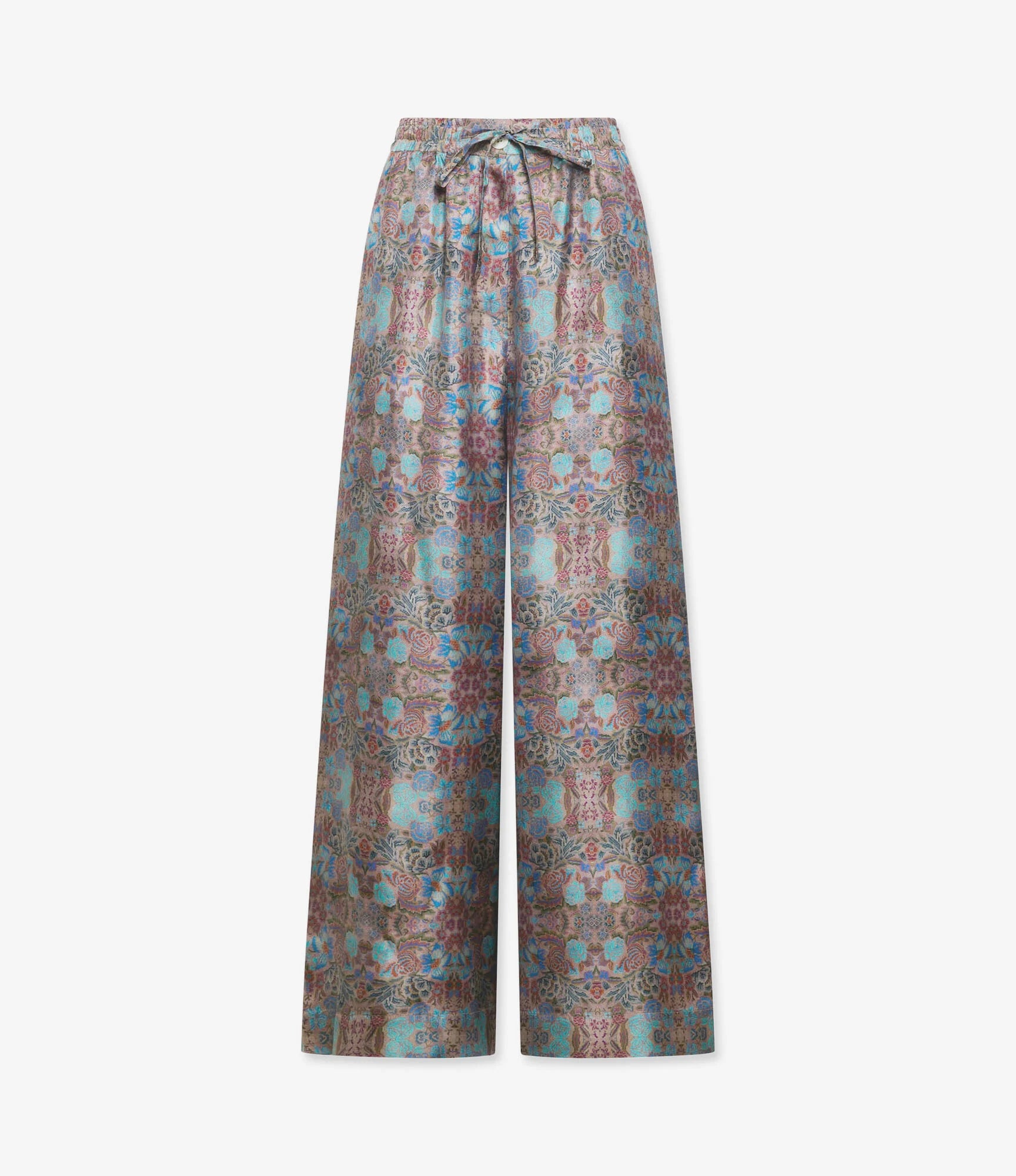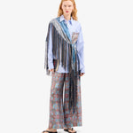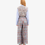 بنطال فضفاض بخصر مطاطي، وساق واسعة، وجيوب جانبية. إغلاق بأزرار ورباط. طبعة زهور مستوحاة من الطراز القديم بألوان باهتة ناعمة مع لمحات من الأزرق السماوي، والفيروزي، والوردي العتيق، ودرجات ترابية. يتميز النمط بتأثير ضبابي خفيف، كما لو كان قد مرّ عليه الزمن. الخامة: 100% حرير. صنع في إيطاليا. المقاسات إيطالية.