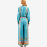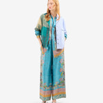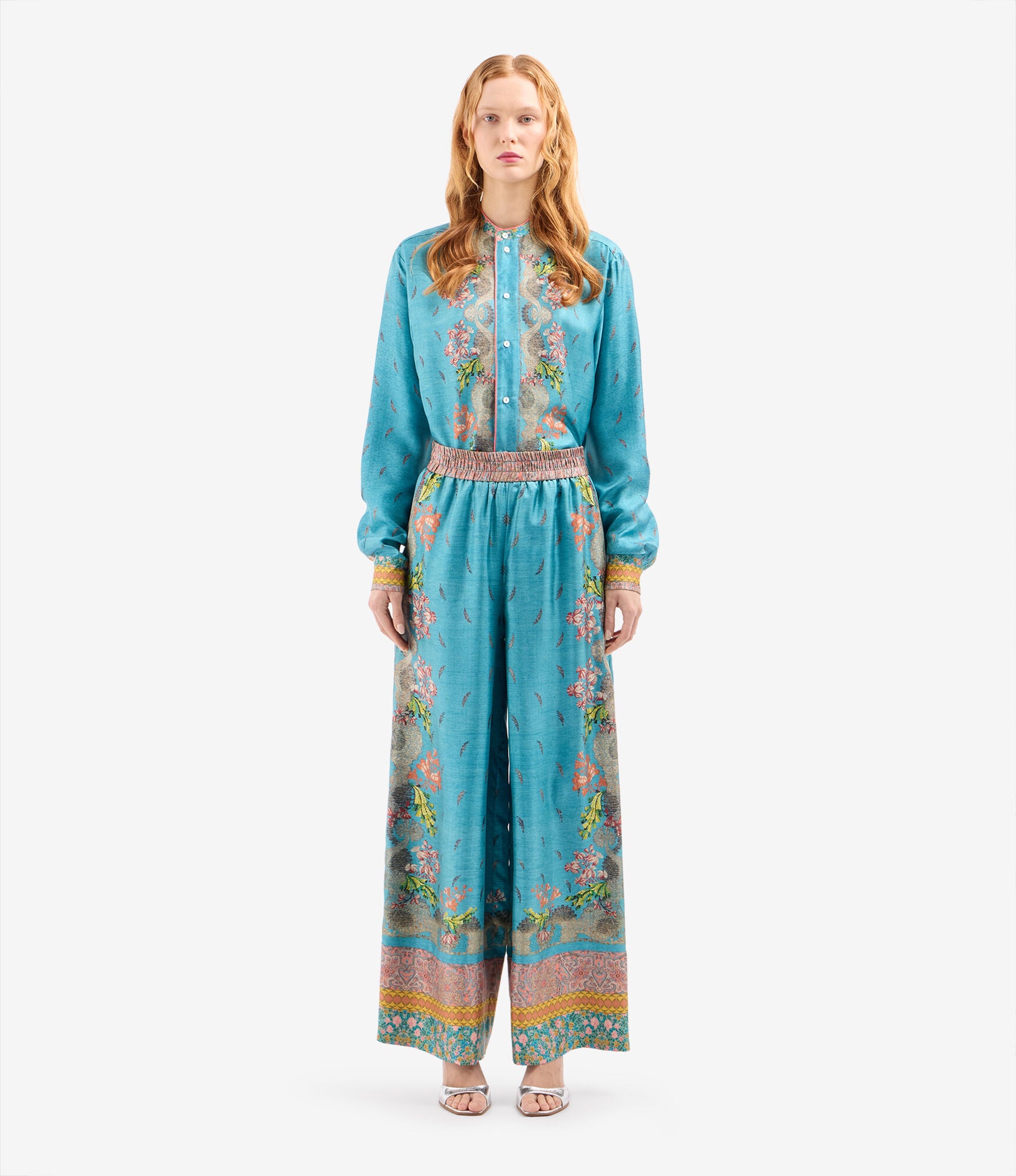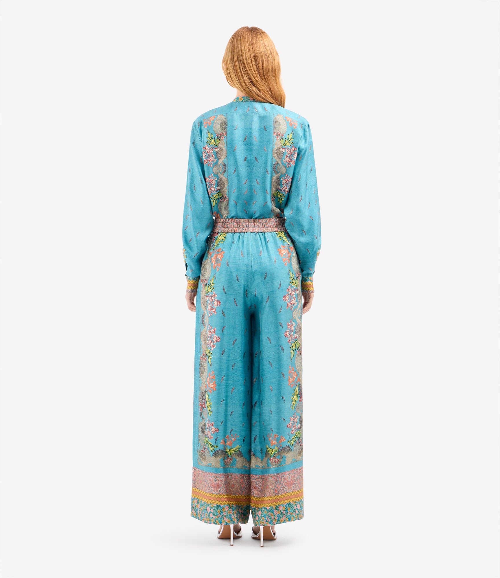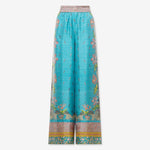 بنطال فضفاض بخصر مطاطي، وساق واسعة، وجيوب جانبية. لون فيروزي مع مزيج من نقوش بيزلي، وهندسية، وطبعات ليبرتي متعددة الألوان. حواف مزينة. الخامة: 100% حرير. صنع في إيطاليا. المقاسات إيطالية.