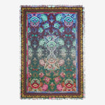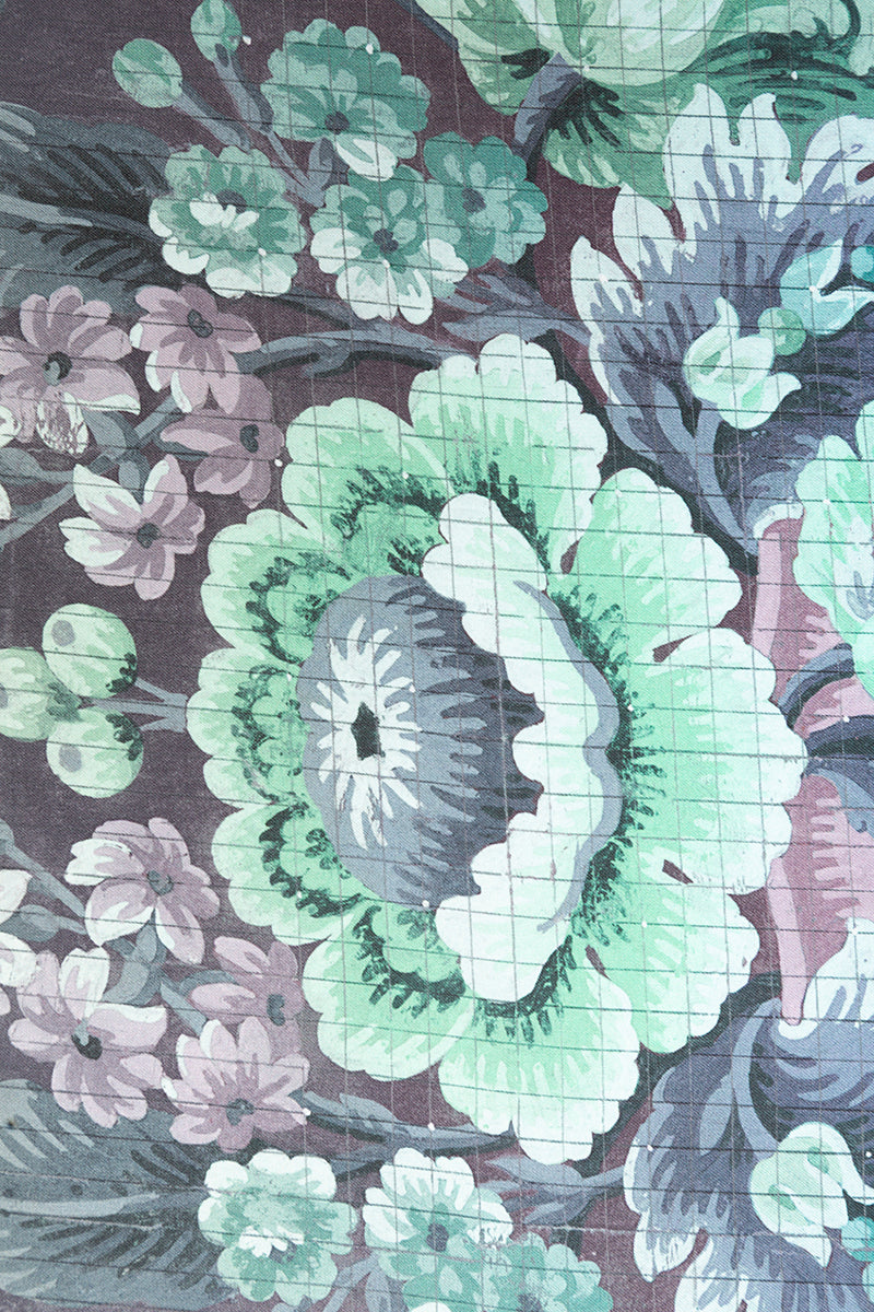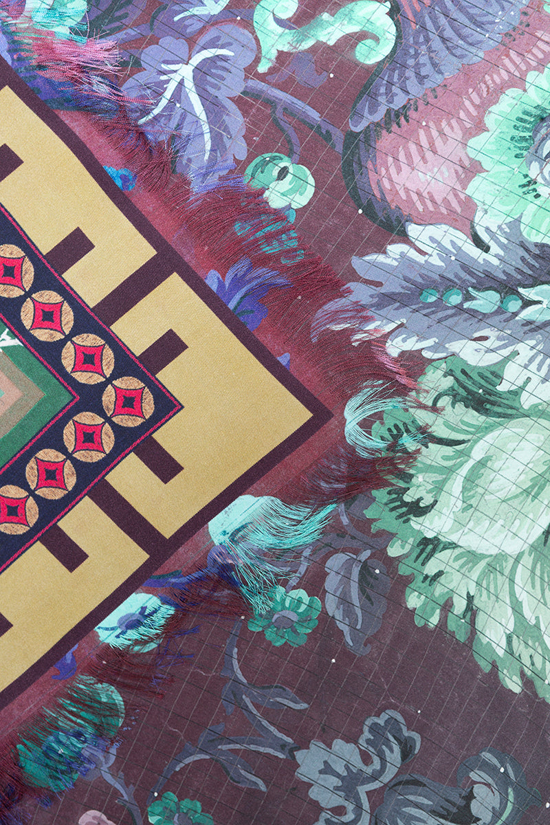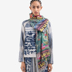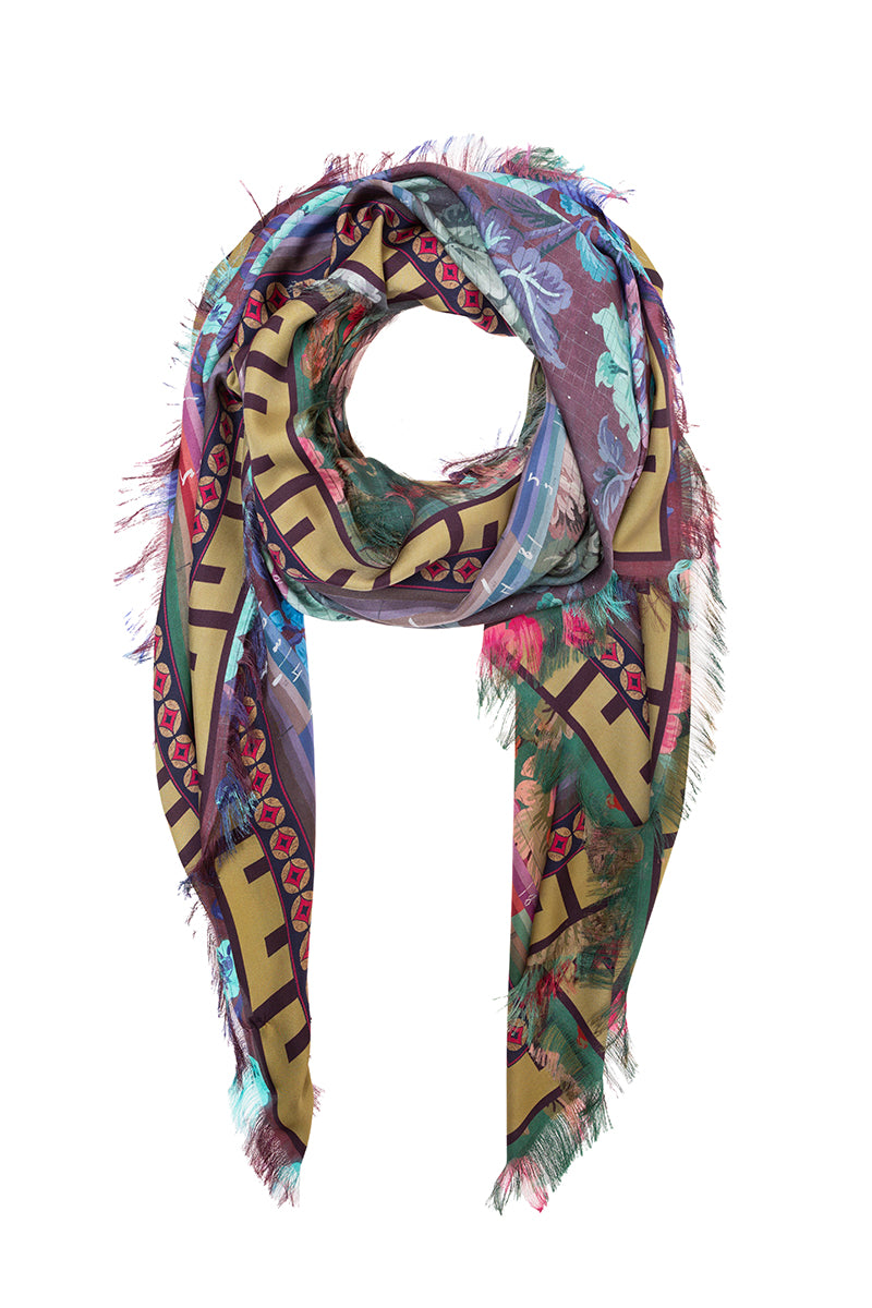 وشاح من الحرير الطبيعي. طبعة زهور كلاسيكية من قماش الكريتون بألوان الفيروزي والبنفسجي والأخضر، مستوحاة من الطراز الباروكي. الخامة: حرير 100%. حافة متوسطة التفاوت. المقاس: 135 × 195 سم. صنع في إيطاليا.