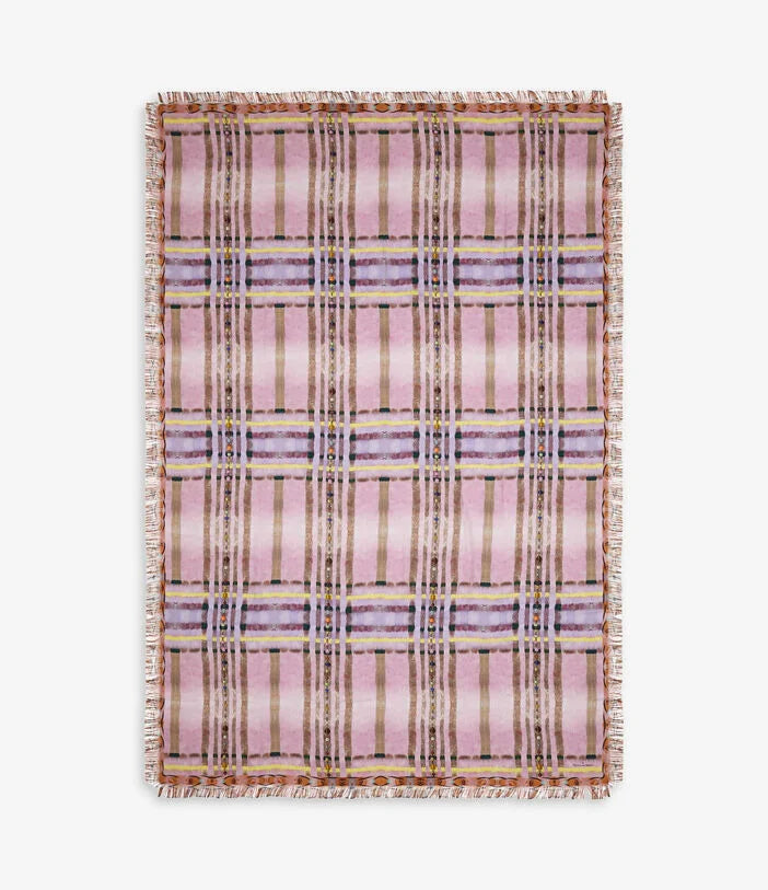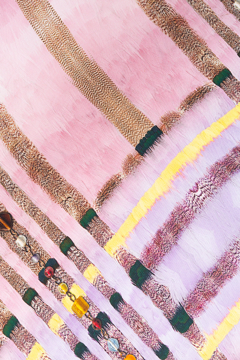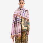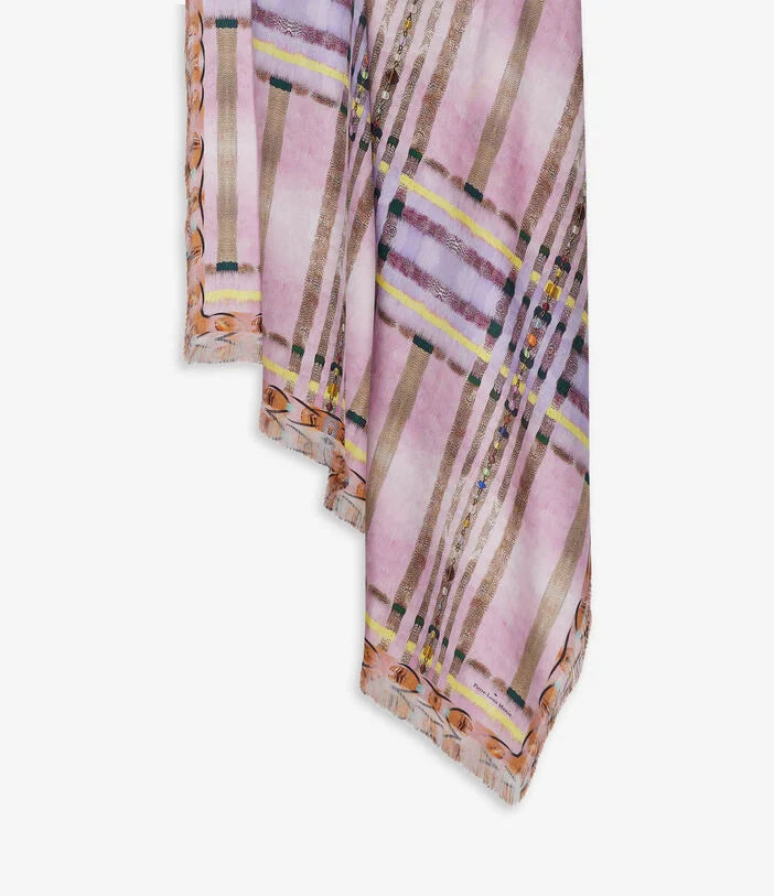وشاح من الحرير الطبيعي. طبعة هندسية لمربعات مُعاد تصميمها، مع لمسة يدوية زخرفية بألوان البيج والأصفر على خلفية وردية وبنفسجية. الخامة: 100% حرير. متوسط التنسيل. المقاس: 135 × 195 سم. صنع في إيطاليا.
