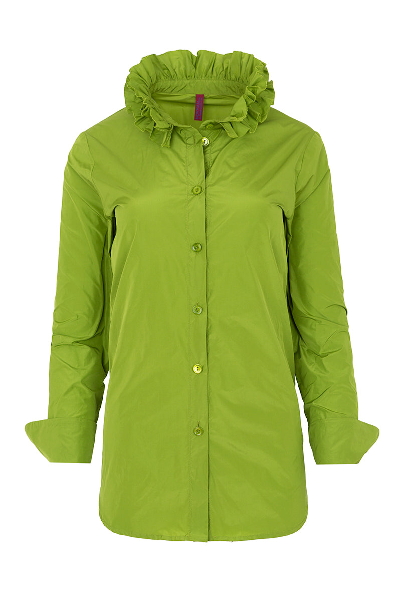 قميص مصنوع من قماش تقني بياقة مزدوجة الكشكشة، وأزرار متناسقة، وأساور أكمام مزدوجة مستديرة. اللون: بيتاشو. التركيب: 100% بوليستر. لا يُنصح بكيّ هذا القماش. المقاسات ألمانية.