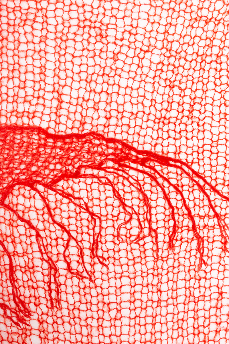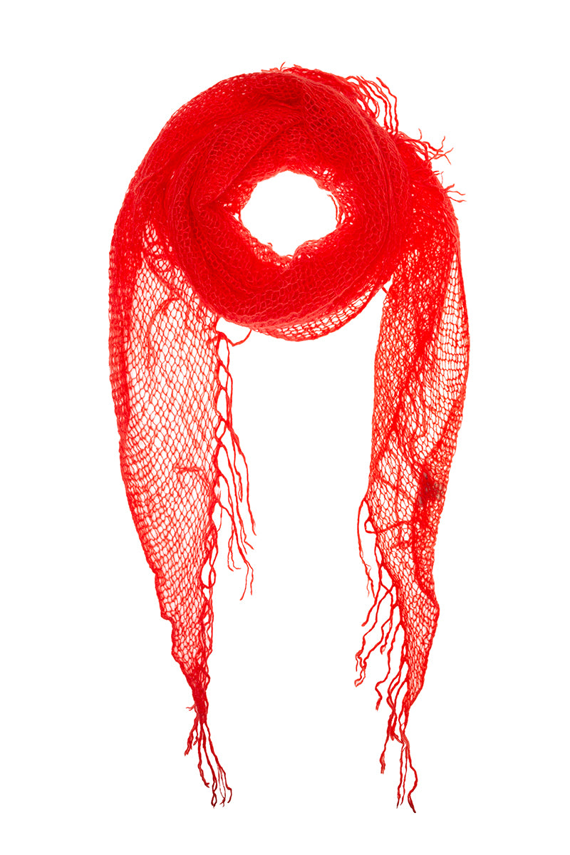 عباءة مثلثة الشكل بلون المرجان، مصنوعة من نسيج شبكي محبوك. مزينة بشراشيب. الخامة: 100% كشمير. صناعة يدوية في نيبال.