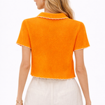 جاكيت قصير مفتوح التصميم بلون برتقالي نيون، مزين بحواف بيج على الياقة والجزء الأمامي والأكمام. أكمام قصيرة. التركيب: 95% قطن، 5% كشمير.