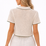 جاكيت قصير مفتوح التصميم بلون طبيعي، مزين بحواف خضراء على الياقة والجزء الأمامي والأكمام. أكمام قصيرة. التركيب: 95% قطن، 5% كشمير.