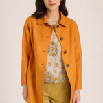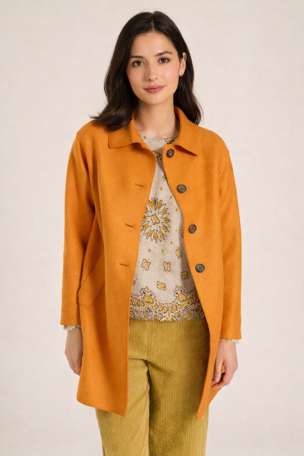 معطف صوفي بقصة مستقيمة وياقة قميص، بلون برتقالي يوسفي، مزود بجيوب أمامية وإغلاق بأربعة أزرار. الخامة: 100% صوف بكر. المقاسات إيطالية. صنع في إيطاليا.