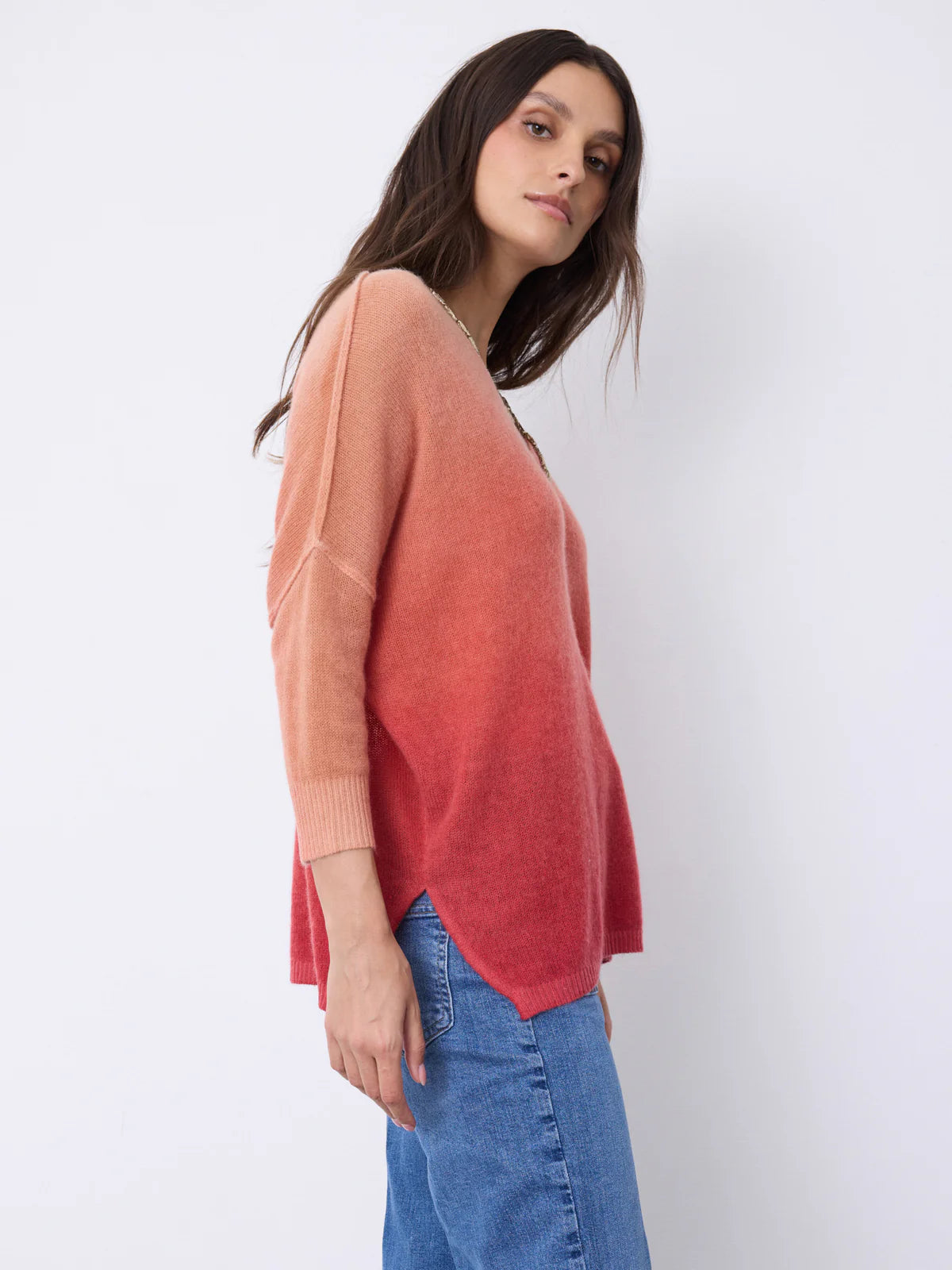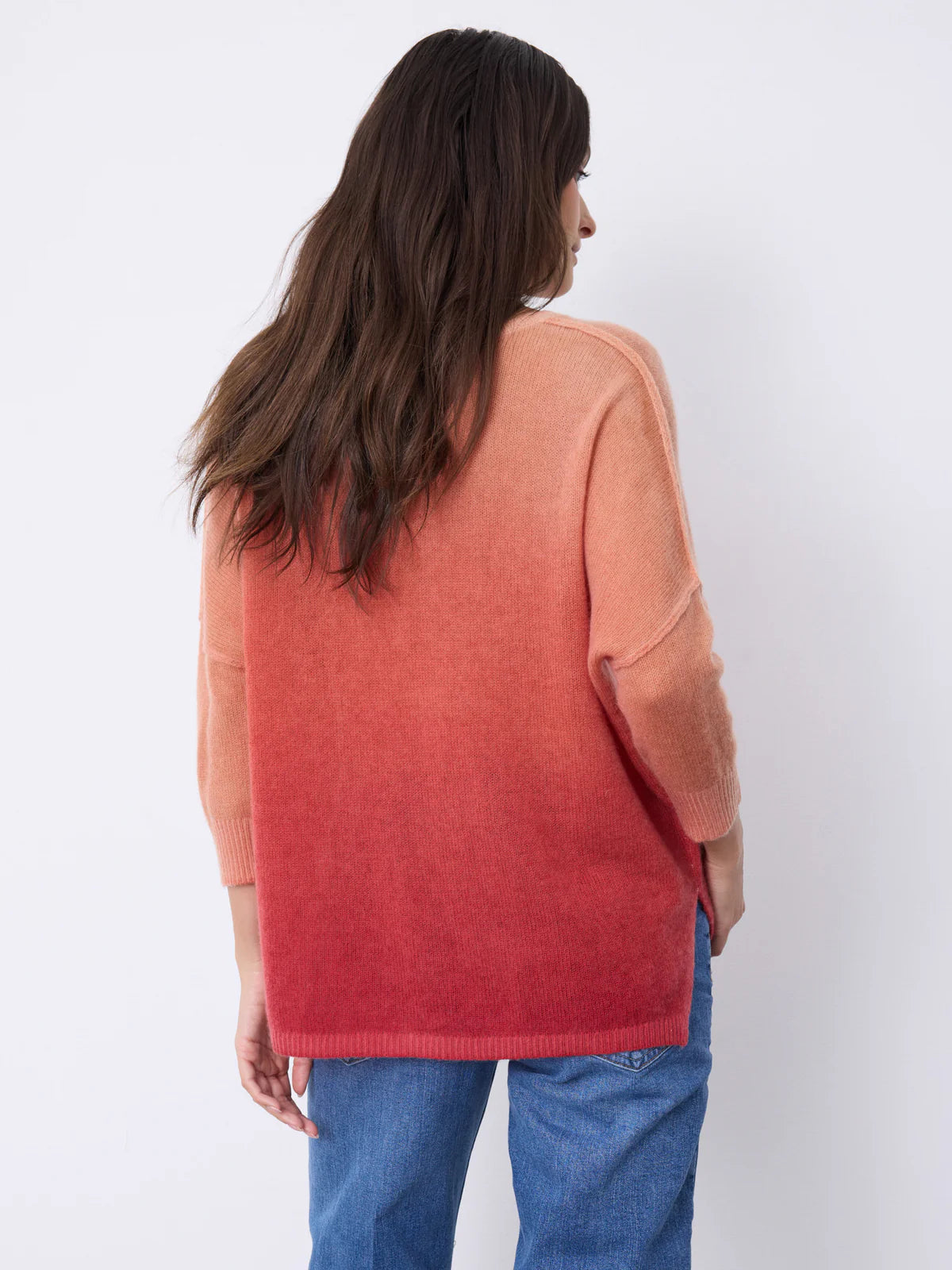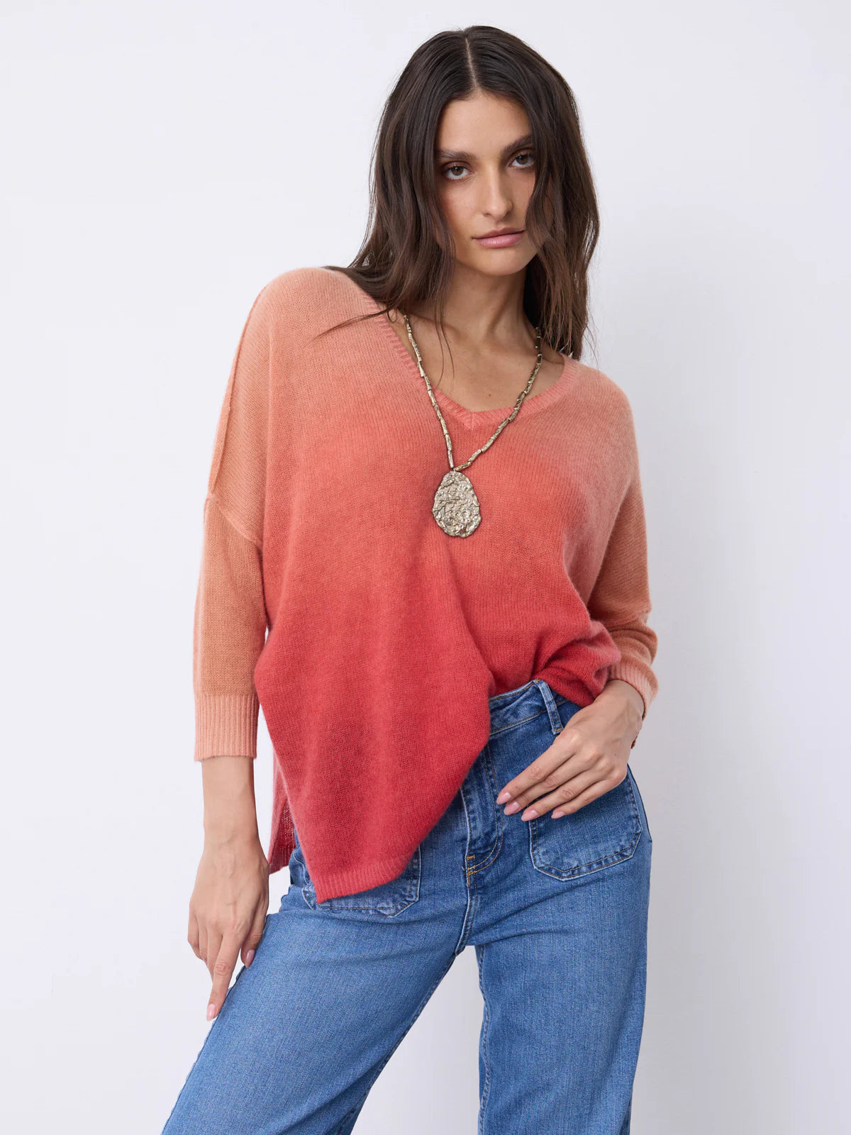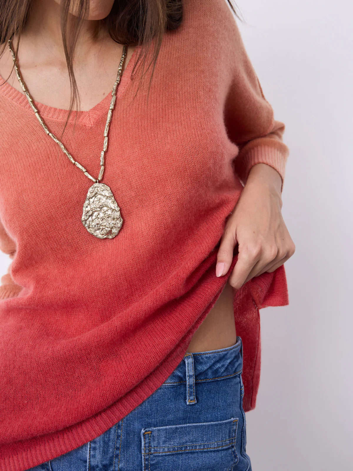 كنزة من ماركة نوتشي بلون الصدأ، بفتحات جانبية وأكمام واسعة تنتهي بأساور مضلعة تصل إلى المرفق. الخامة: 100% كشمير.