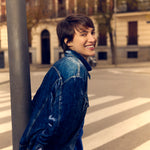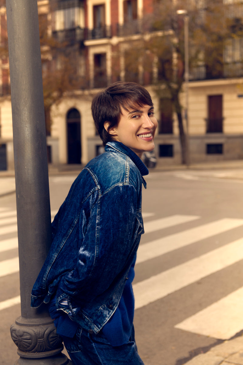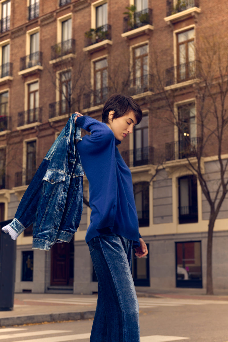 جاكيت مخملي واسع قليلاً بقصة جينز وتأثير عتيق. يتميز ببطانة مخططة باللونين الأبيض والأزرق. التركيب: 82% فيسكوز، 18% حرير. صنع في إيطاليا. المقاسات إيطالية.