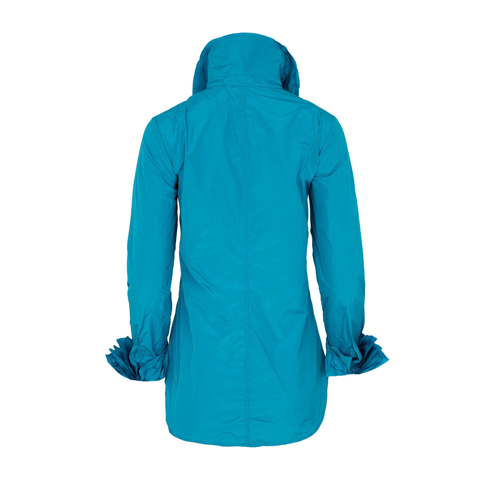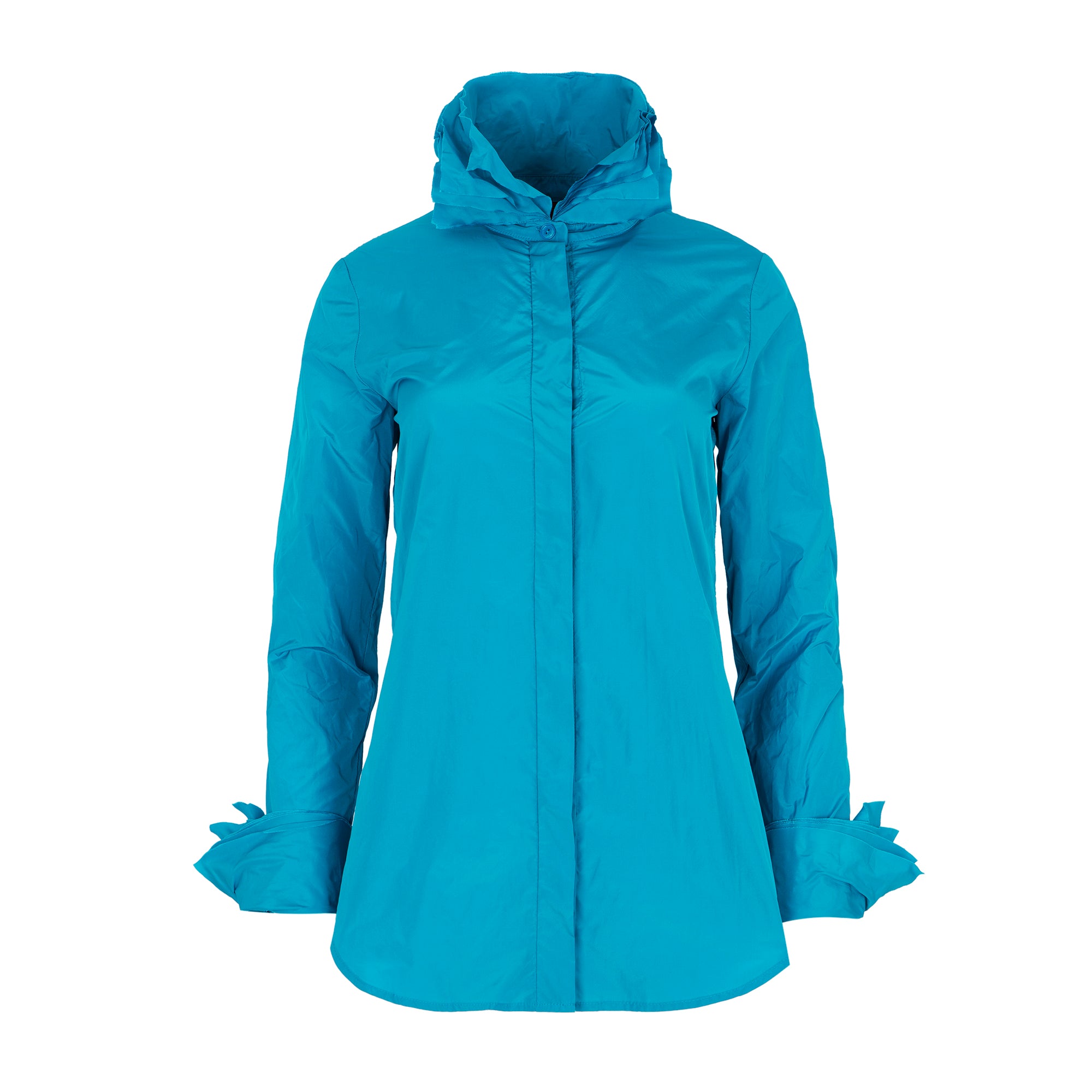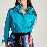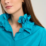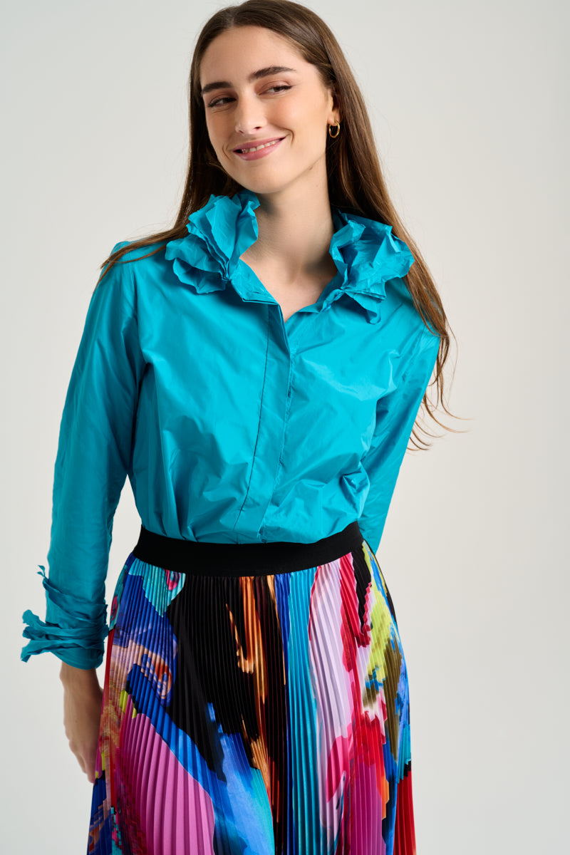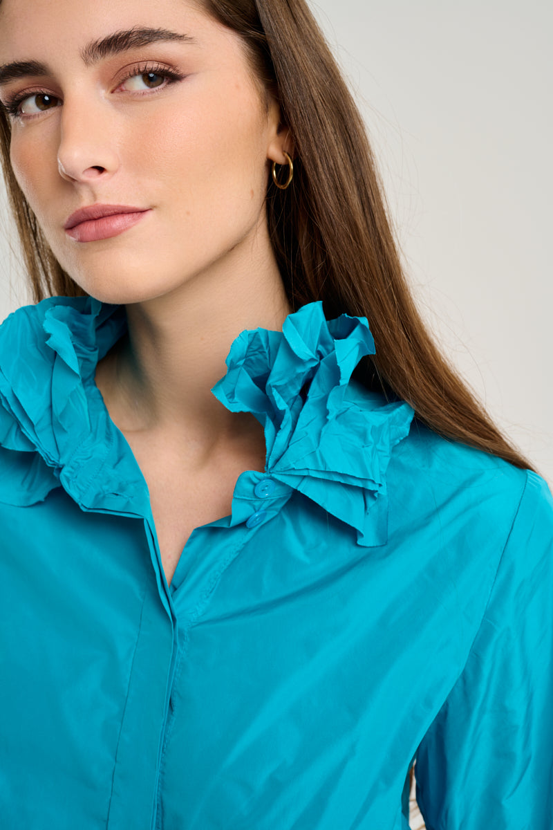 قميص من قماش تقني بلون أزرق مائي، بأزرار وأكمام طويلة متناسقة. يتميز بياقة مكشكشة وأساور طويلة. لا يُنصح بكيّ هذا القماش. التركيب: 100% بوليستر.