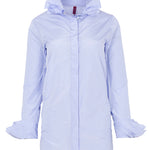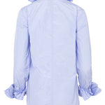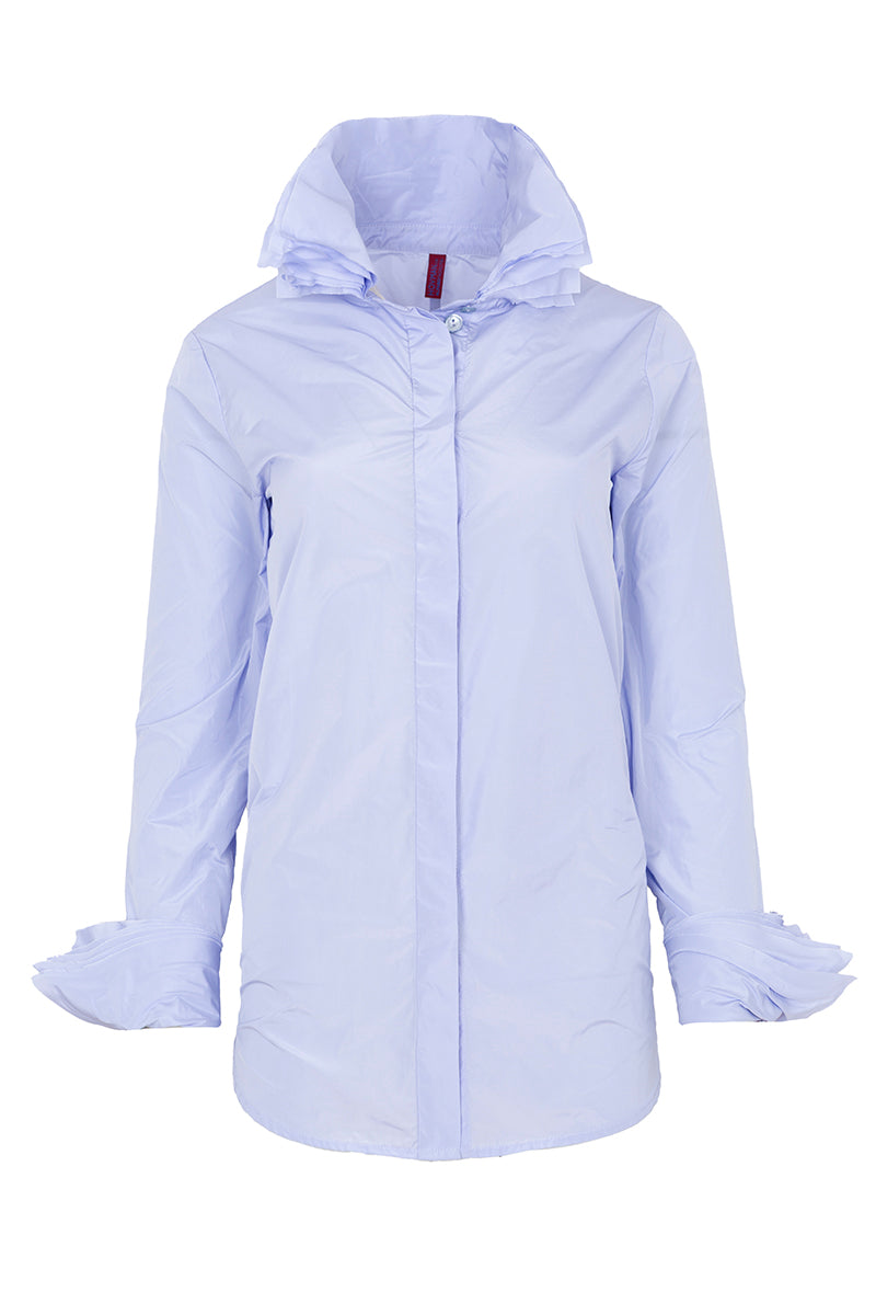 قميص من قماش تقني بلون بنفسجي فاتح، بأزرار وأكمام طويلة متناسقة. يتميز بياقة مكشكشة وأساور متدلية. لا يُنصح بكيّ هذا القماش. التركيب: 100% بوليستر. المقاسات ألمانية.