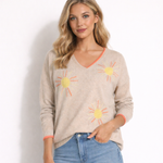 كنزة بياقة على شكل حرف V بلون بيج فاتح. حواف وردية اللون على الياقة والأكمام. تفاصيل تطريز على شكل شمس بألوان البرتقالي والأصفر والأزرق. الخامة: 100% كشمير.