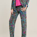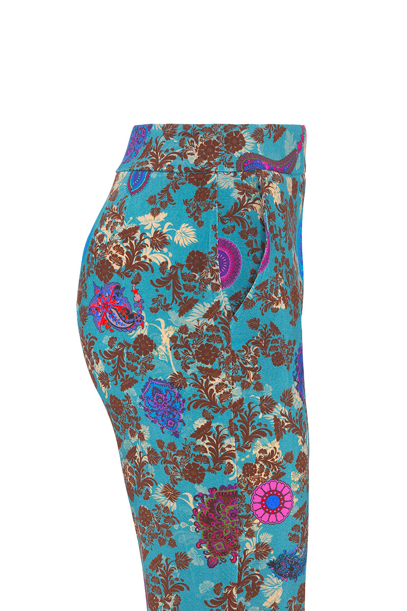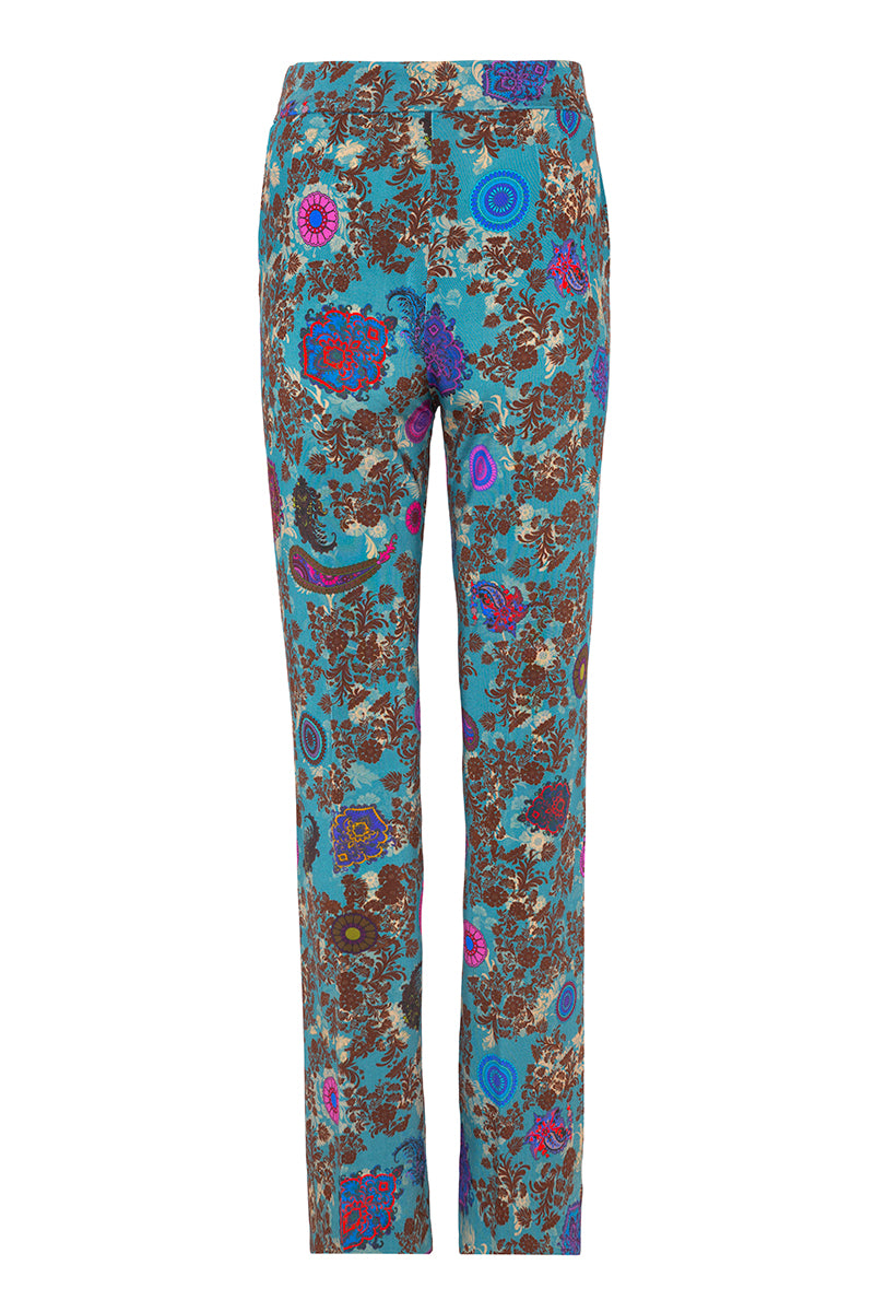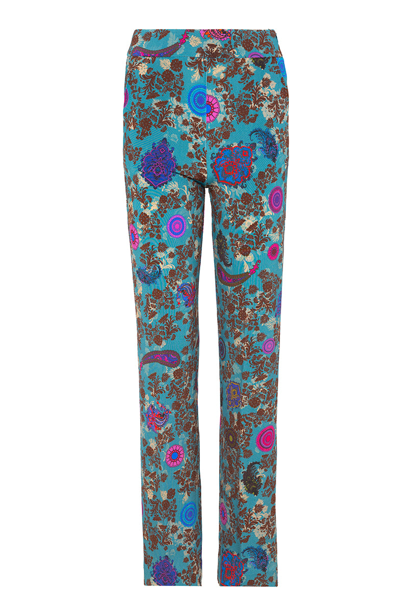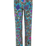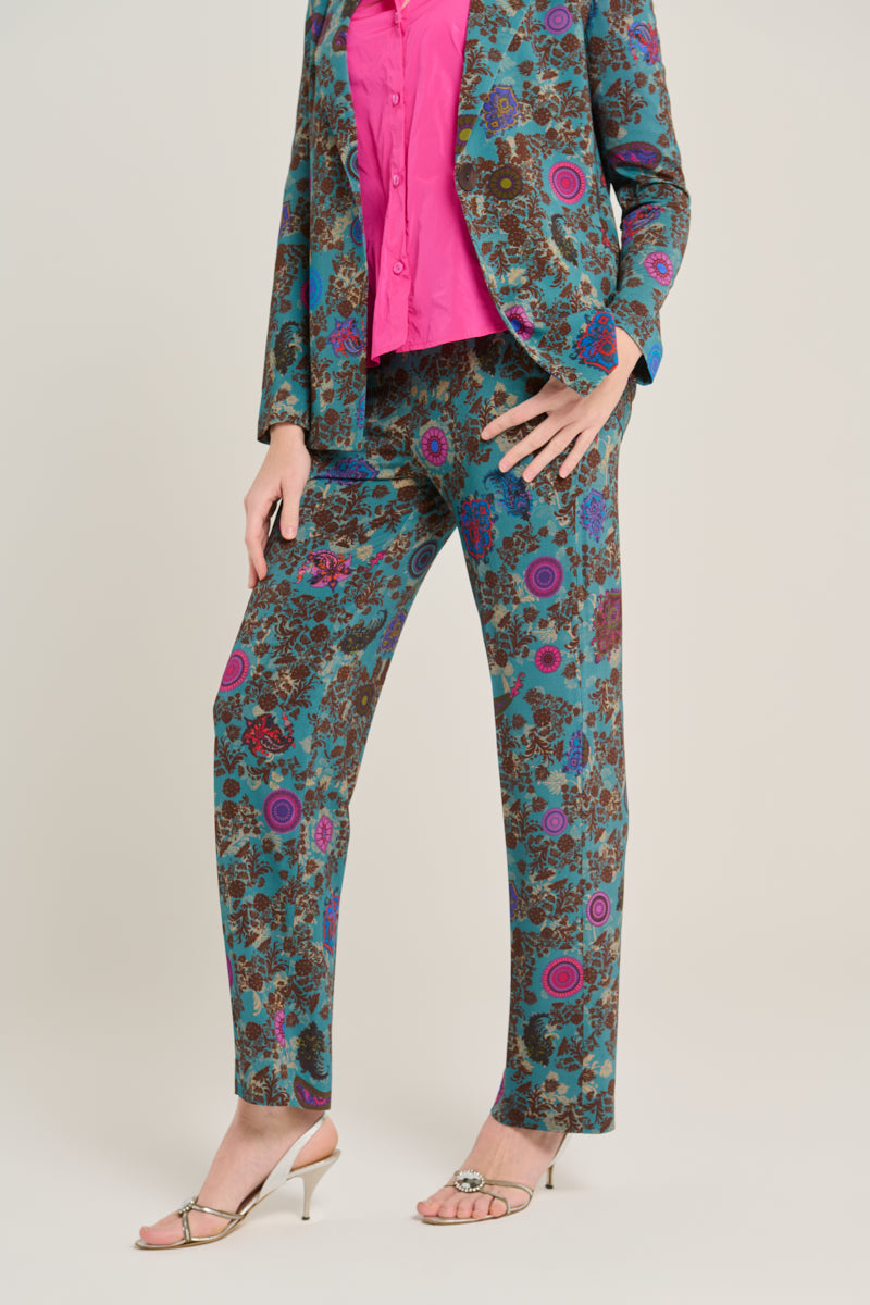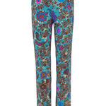 بنطال مريح من قماش الجيرسيه المحبوك من ماركة فيا ماسيني 80 الإيطالية. قصة مستقيمة، جيوب جانبية، وسحاب جانبي. نقشة زهور وبيزلي بألوان الفوشيا والبني والأزرق الملكي على خلفية زرقاء بترولية. التركيب: 93% فيسكوز، 7% إيلاستين. صنع في إيطاليا. المقاسات إيطالية.