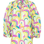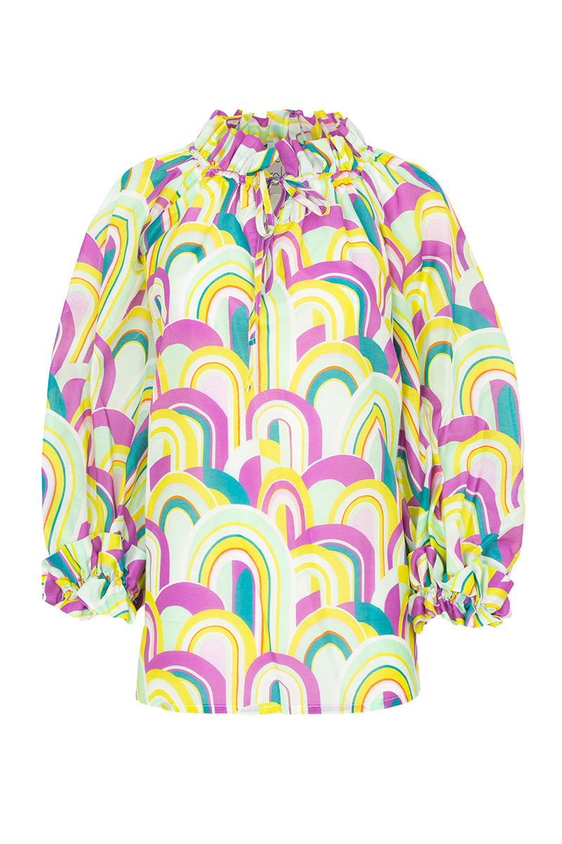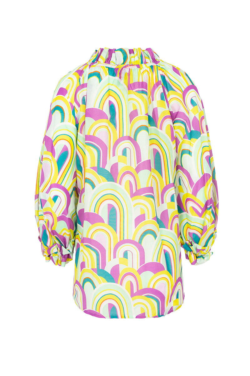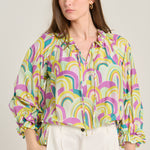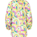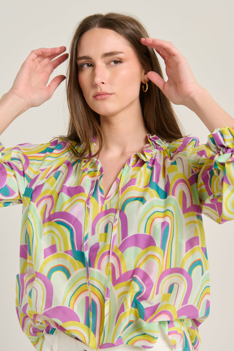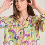 Blusón de la firma Italiana Sara Roka, con detalle de volante en cuello y puños, manga ranglan afarolada y aberturas laterales. Cierre con lazada y estampado con motivos psicodélicos en tonos violeta, verde manzana, amarillo y azul petróleo. Composión: 80% algodón y 20% seda. Hecho en Italia. Tallaje italiano.