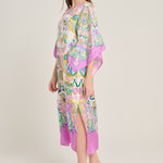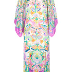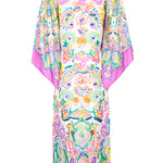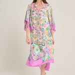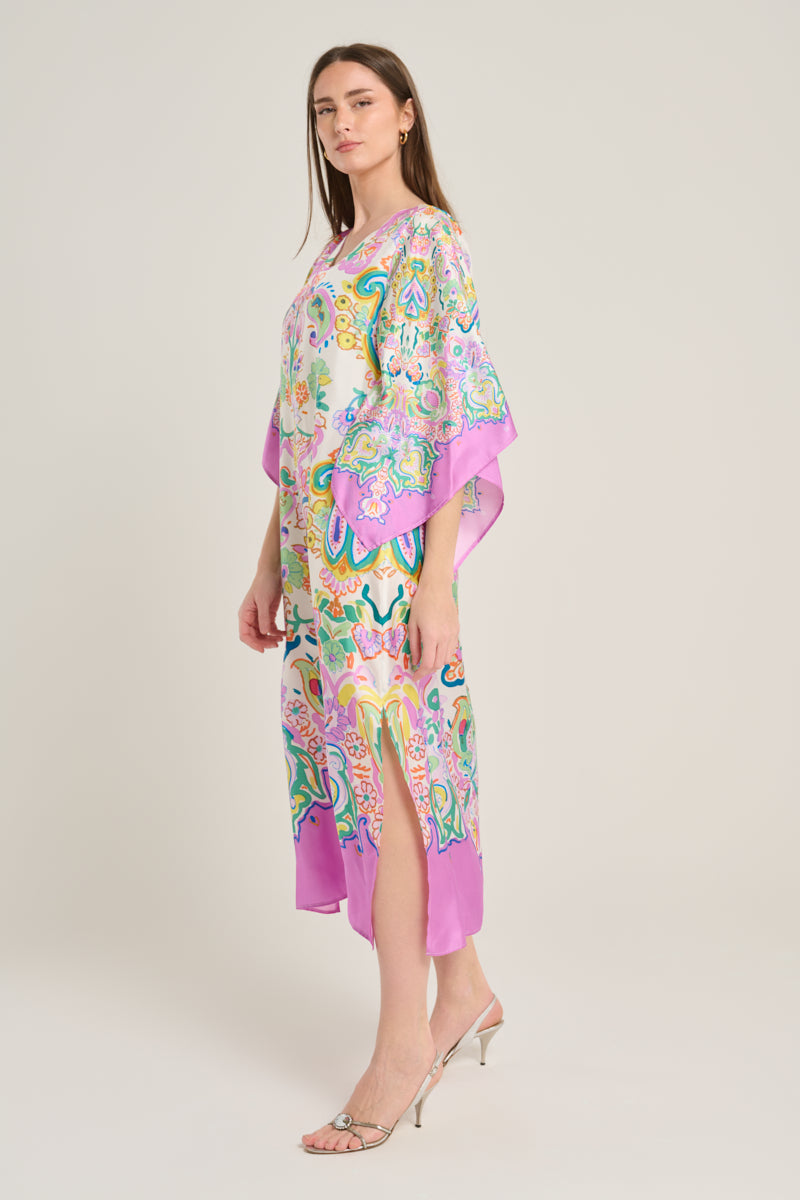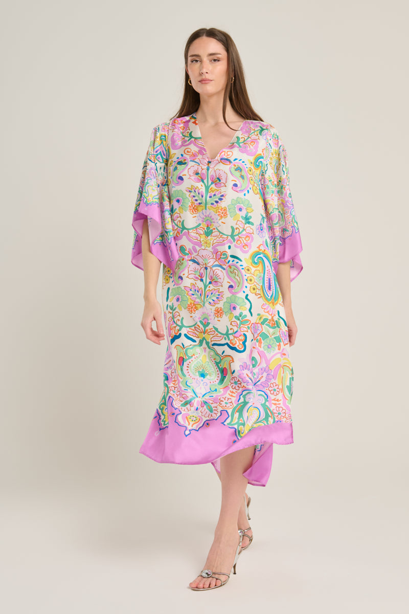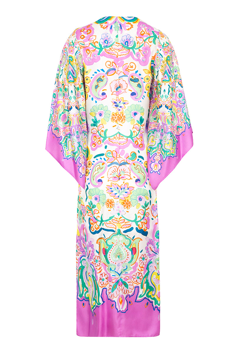 Vestido largo de seda de la firma italiana Sara Roka tipo túnica. Estampado floral tipo Etro en tonos malvas, rosas , verdes sobre fondo blanco y remate inferior en franja rosa. Cuello pico y manga ancha tipo pañuelo en pico . Composición: 100% seda. Tallaje italiano . Hecho en italia