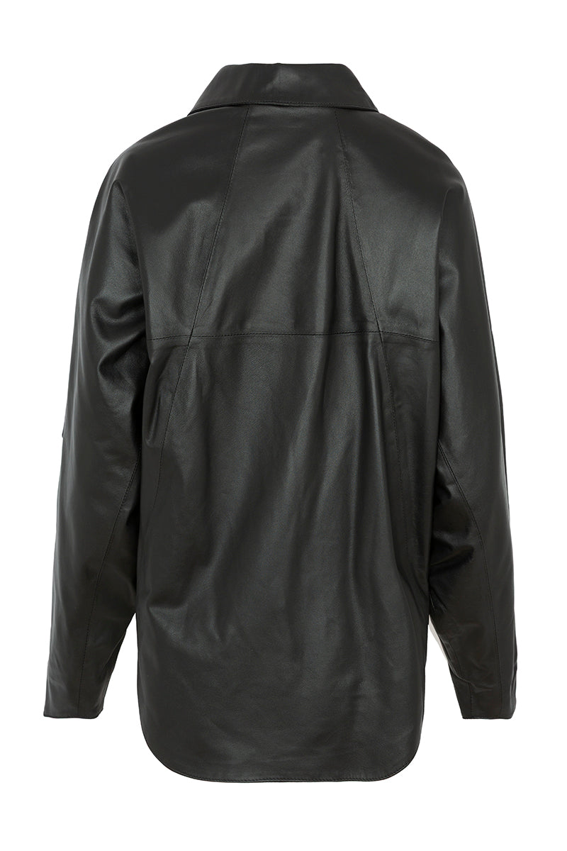 جاكيت جلد أسود. أكمام واسعة، ياقة قميص، وسحاب أمامي. تصميم غير متماثل. جيبان بسحاب. الخامة: جلد طبيعي 100%.