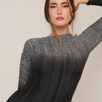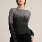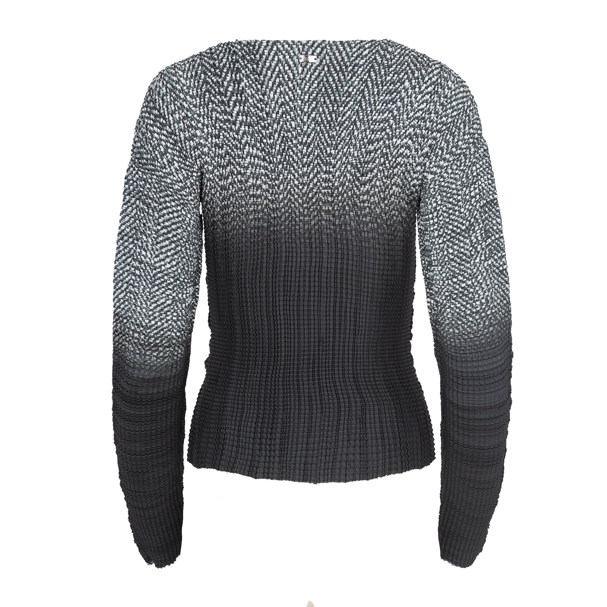 بلوزة مكشكشة بياقة دائرية وأكمام طويلة من هيرنو. بنقشة متدرجة باللونين الأسود والأبيض مع طباعة تشبه الحياكة. الخامة: 100% بوليستر. المقاسات إيطالية. رقم المرجع: BL000012D 12675-9480