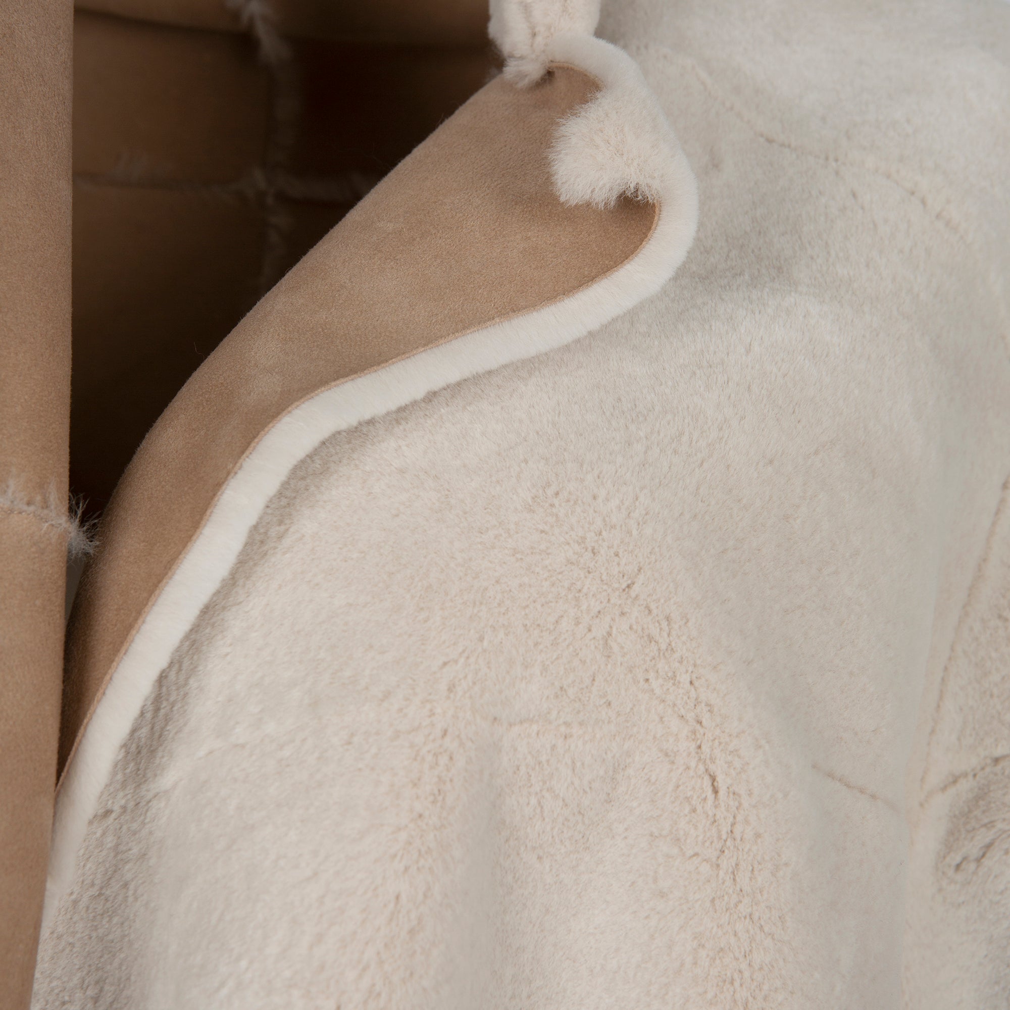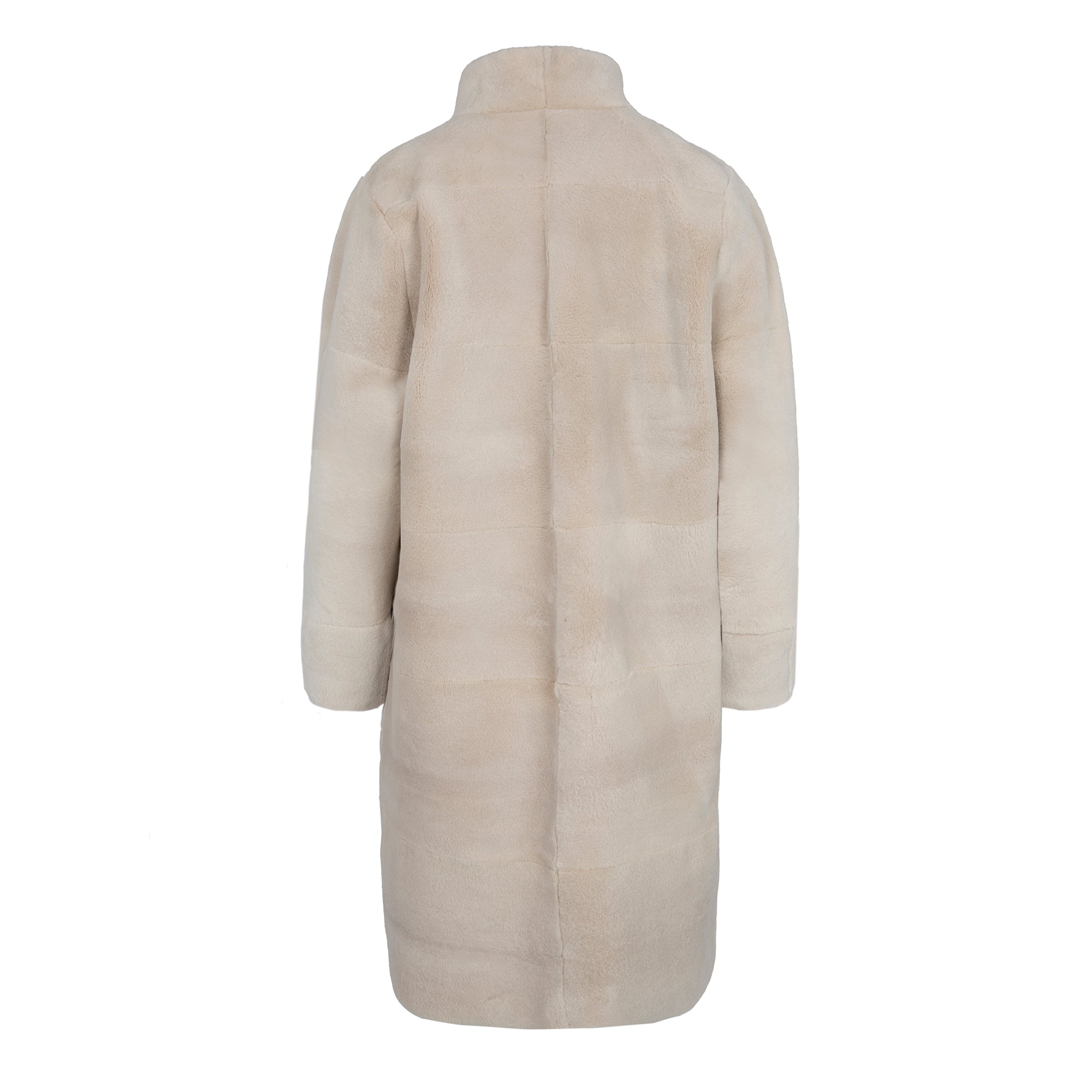 معطف من فرو المنك الأبيض المائل للصفرة، غير منظم، ذو ياقة عالية ولمسة نهائية رملية قابلة للعكس.