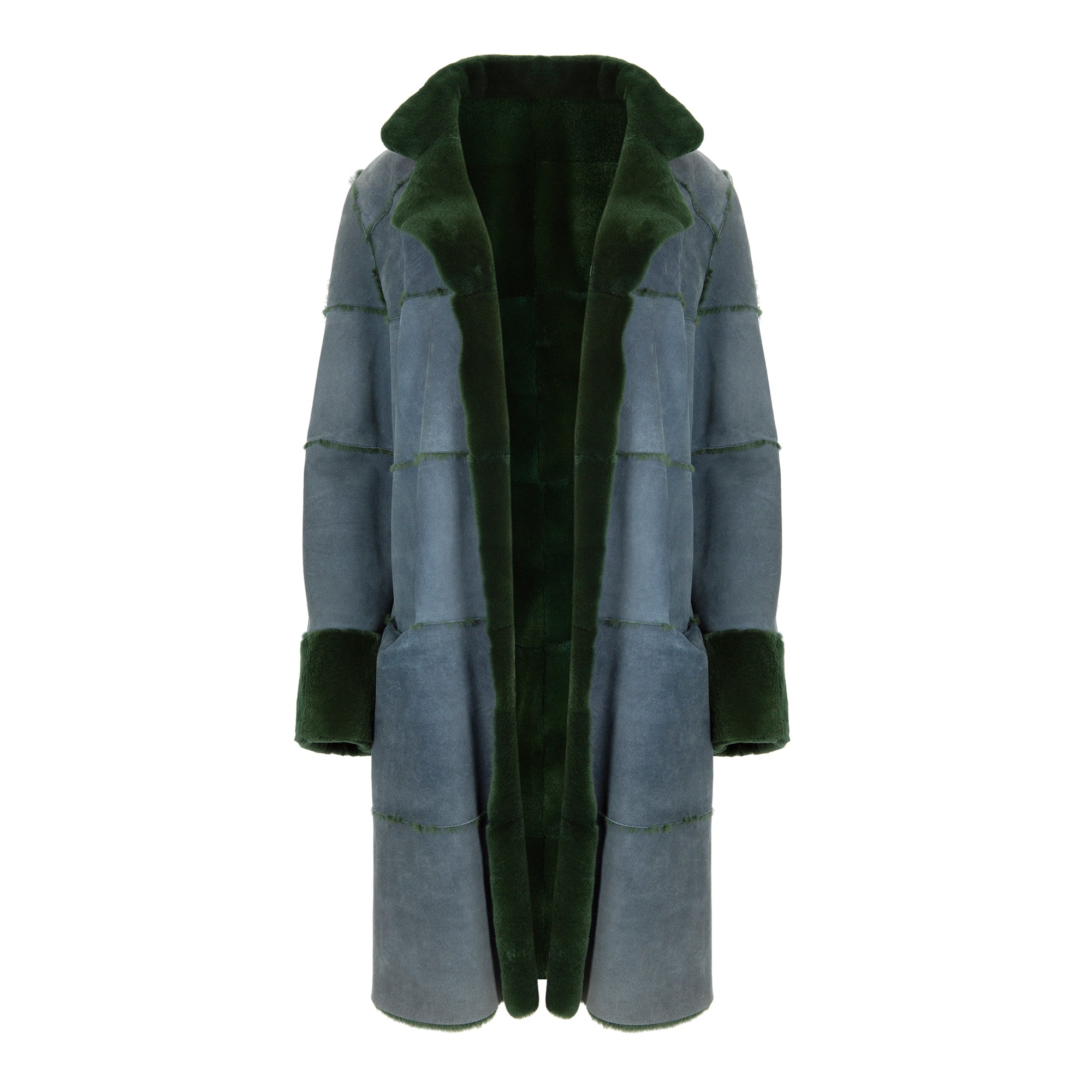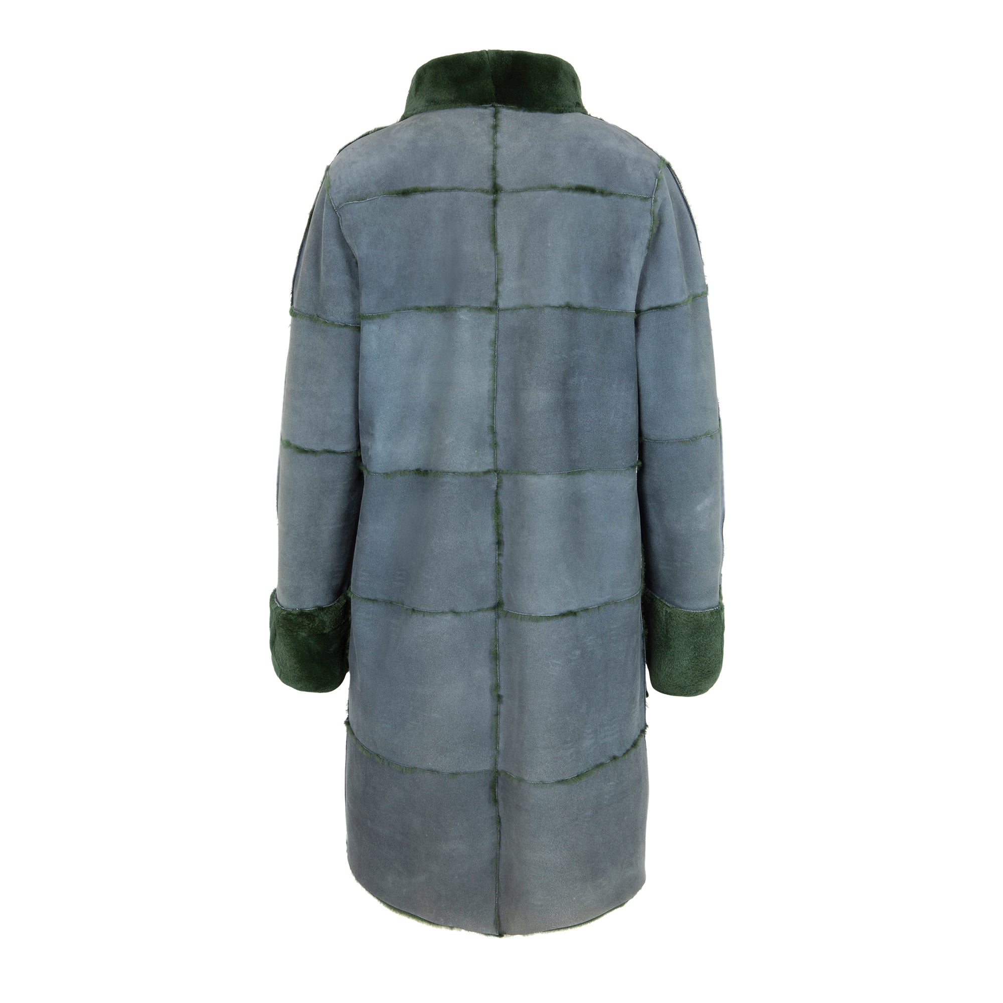 معطف من فرو المنك الأخضر الغابي، غير منظم، ذو ياقة عالية ونهاية قابلة للعكس باللون الأزرق.