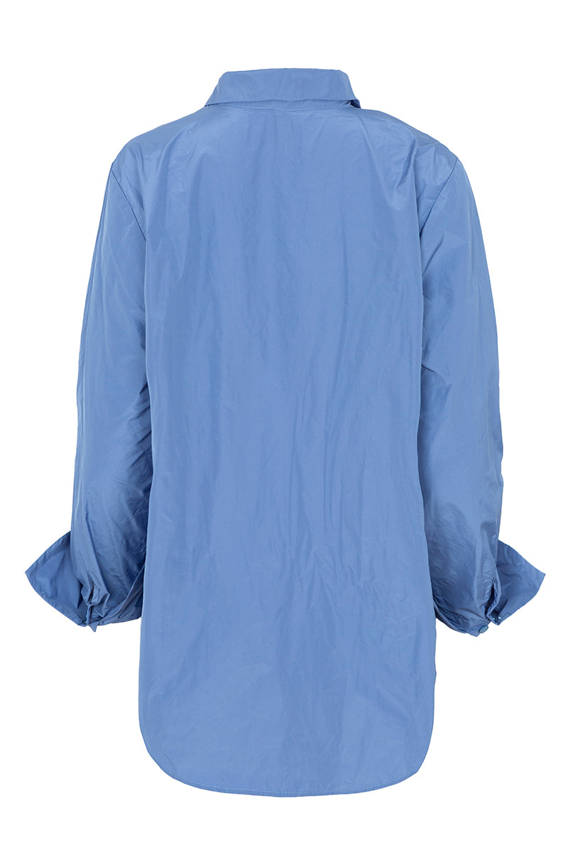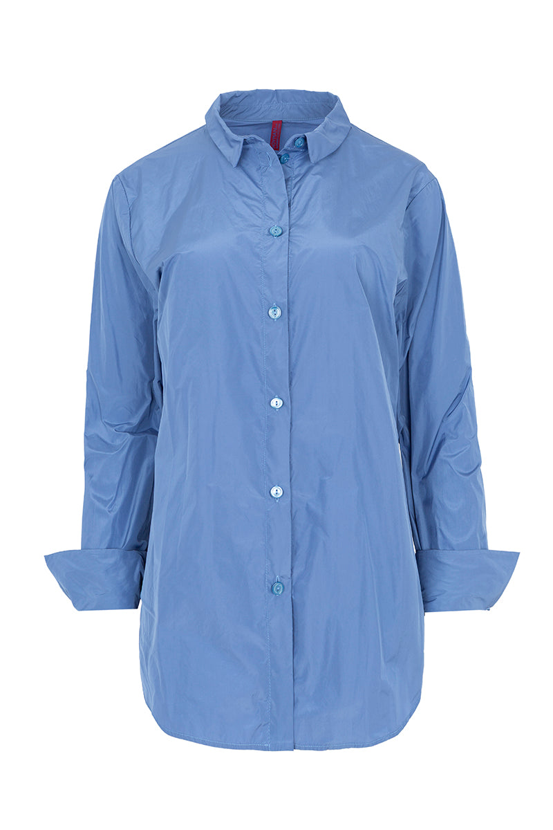 Straight technological fabric shirt with a shirt collar, tone-on-tone buttons, and double cuff. Blue color. Composition: 100% Polyester. This fabric cannot be ironed. German sizing.