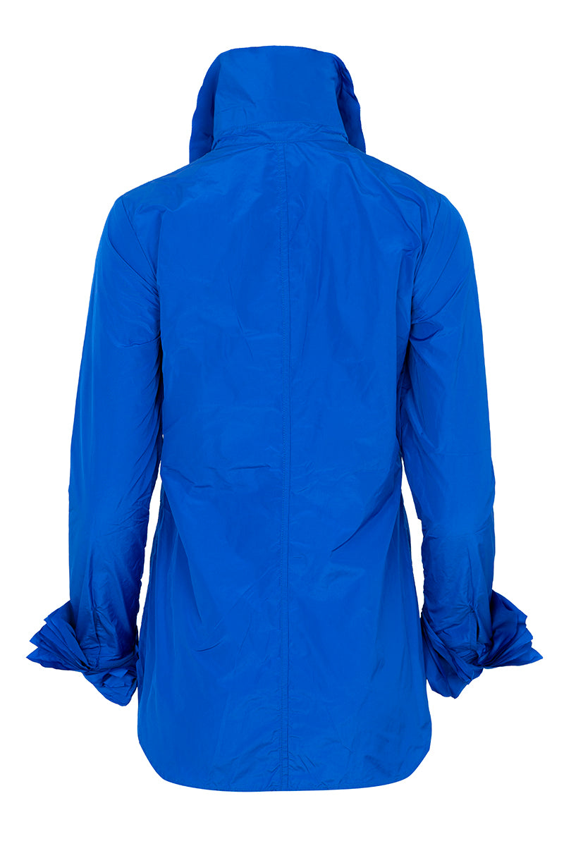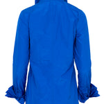 Shirt made of technical fabric in electric blue color, tone-on-tone buttons, and long sleeves. Features a lettuce-edge collar and cuffs with a cascading effect. This fabric cannot be ironed. Composition: 100% Polyester. German sizing.