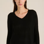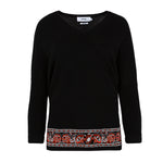 Jersey de cuello pico de la firma francesa Kujten en color negro. Cenefa bordada con motivos arabescos en tonos rojo y blanco. Composición: 100% Cachemire.