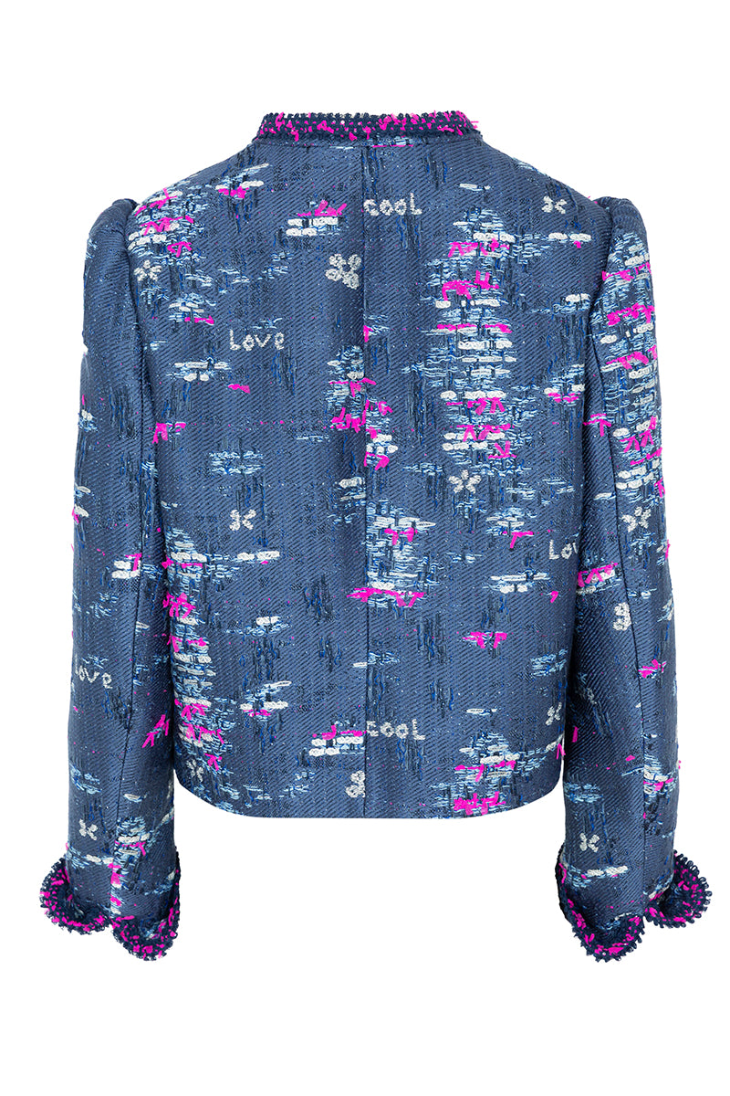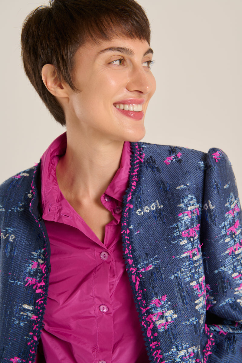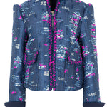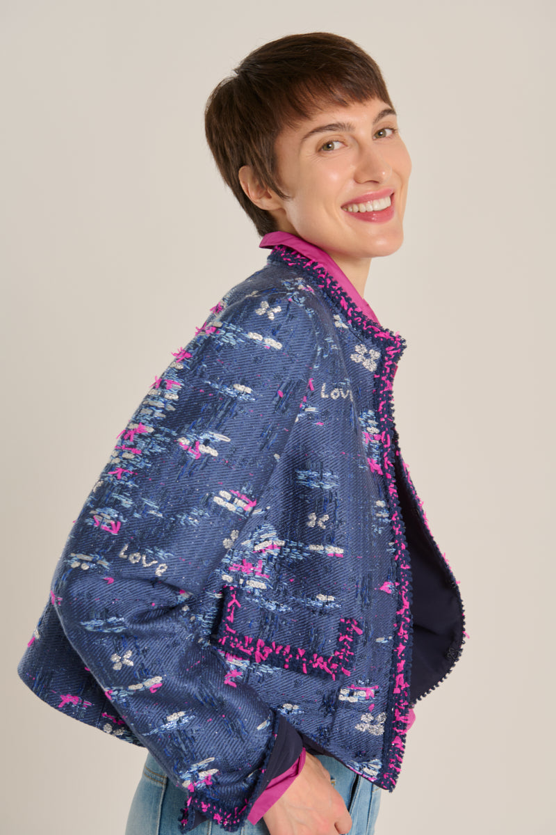Jacket from the German brand MAISON COMMON made of Chanel-style tweed, with embroidery in fuchsia and silver tones on a navy blue background. Straight cut, structured shoulders, and trimmed with contrasting thread applications. Front pockets and snap button closure. Composition: 60% acetate 40% viscose. Made in Germany.