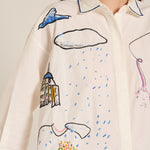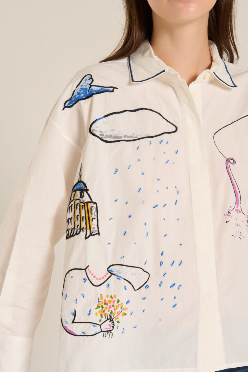 Oversized long-sleeve shirt with a shirt collar, from the brand Mii. Surrealist drawings embroidered in black, blue, and pink tones on a white background. Embroidered details on the collar and cuffs. Hidden button closure with placket. Composition: 100% cotton.