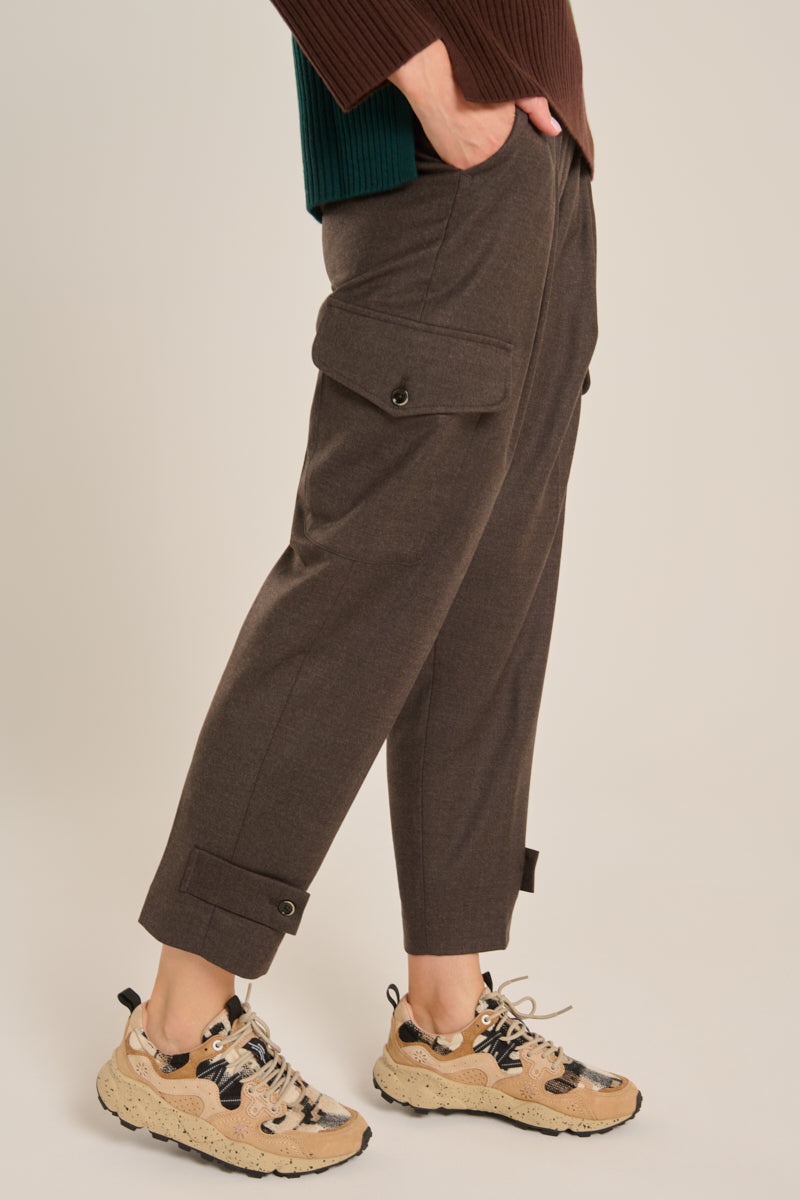Pantalón cargo tono marrón chocolate, de la firma italiana Nine in the Morning . Bolsillos en delantero, espalda y grandes bolsillos de parche con tapeta y botón a la altura de la rodilla.Tiro alto y cierre con botón y cremallera. Trabilla con botón en el bajo. Composición: 99%Lana, 1% elastán.