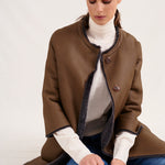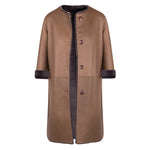 Spanish lambskin coat. Three-quarter sleeves with a crew neck and reversible trim. Dry-leaf nappa leather interior and anthracite-colored treated fur exterior. Tortoiseshell clip button. 100% Spanish lamb.